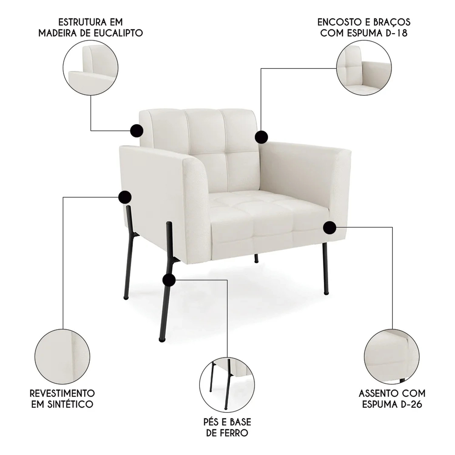 Esta Poltrona Para Sala é revestida em Sintético, que é durável e fácil de limpar, e ainda valoriza o design da poltrona. Os braços e encosto são confortáveis em espuma D-18, já o assento é com espuma D-26 de alta densidade, que garante um assento firme e aconchegante, ideal para relaxar após um dia cansativo. Os Pés de Ferro, não só garantem estabilidade e longevidade, mas também adicionam um toque de luxo ao design geral. A poltrona tem uma estrutura resistente e suporta até 120 kg. A montagem é muito simples, pois a Poltrona já vem pronta, bastando apenas fixar a base com os parafusos que acompanham o produto. A limpeza também é muito prática, pois basta utilizar um pano limpo e levemente úmido, sem produtos abrasivos, para manter a sua poltrona sempre em bom estado. Sem dúvidas um item que vai transformar a sua sala em um ambiente mais confortável e estiloso!