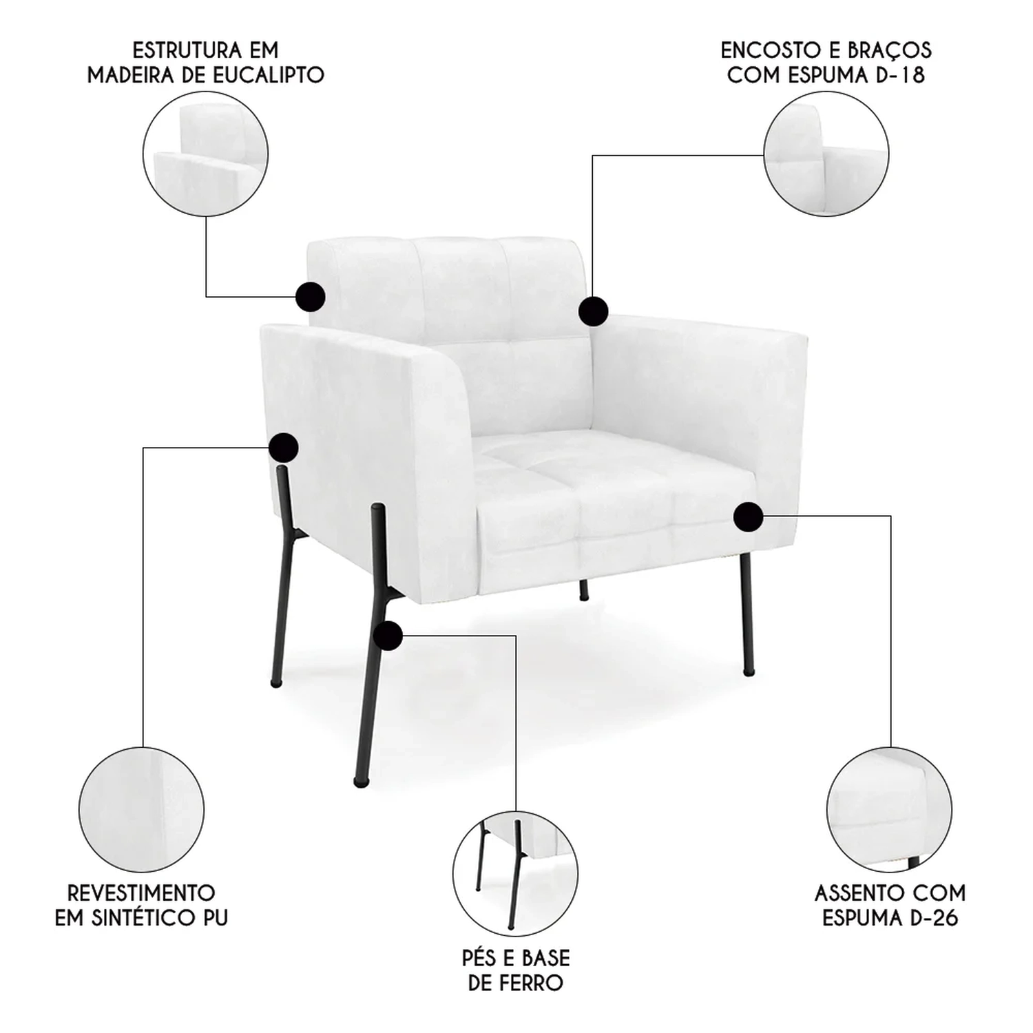 Você está procurando uma poltrona que combine com a sua Sala De Estar, recepção ou seu quarto, que ofereça conforto e qualidade? Então você vai adorar a Poltrona Para Sala Pés Metálicos Preto Ana Sintético PU Branco, da Ibiza!