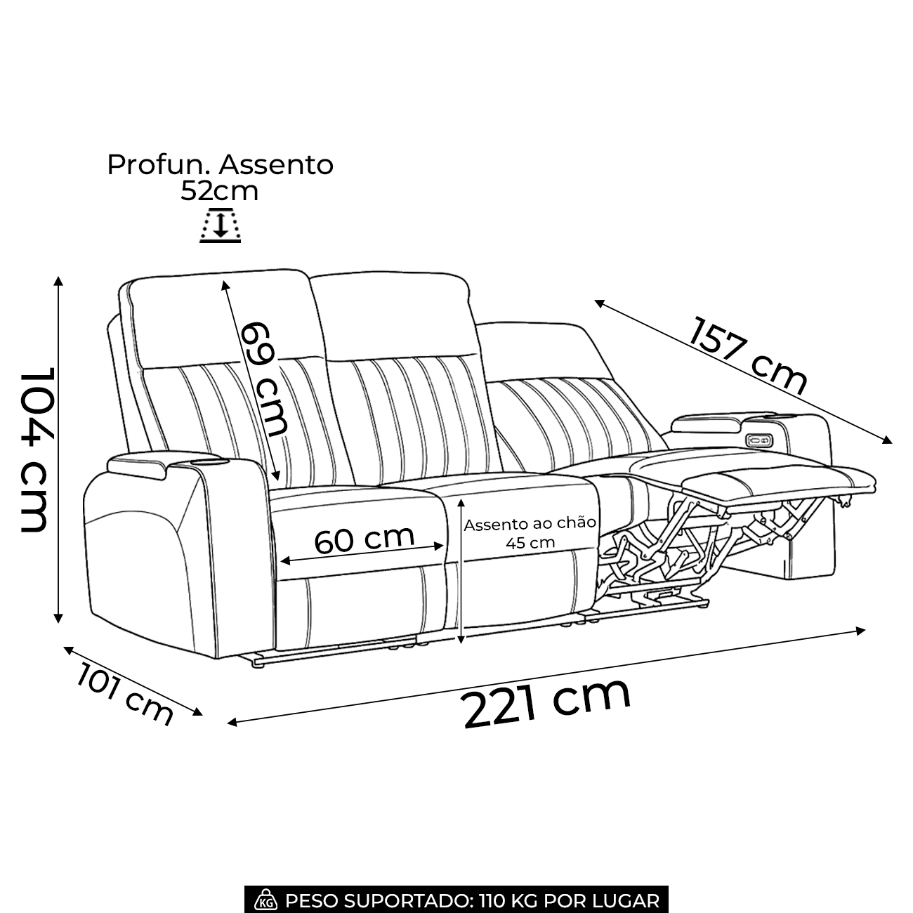 Profundidade do Assento: 52 cm.