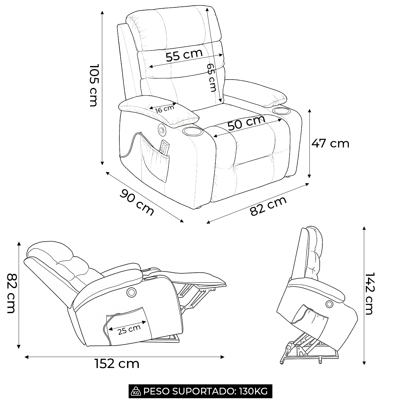 Equipada com função massageadora de 6 modos e 3 intensidades, proporciona relaxamento e alívio das tensões do dia a dia. Os recursos integrados, como porta copos e porta celular, ampliam a praticidade e reforçam o conceito de Conforto aliado à tecnologia.