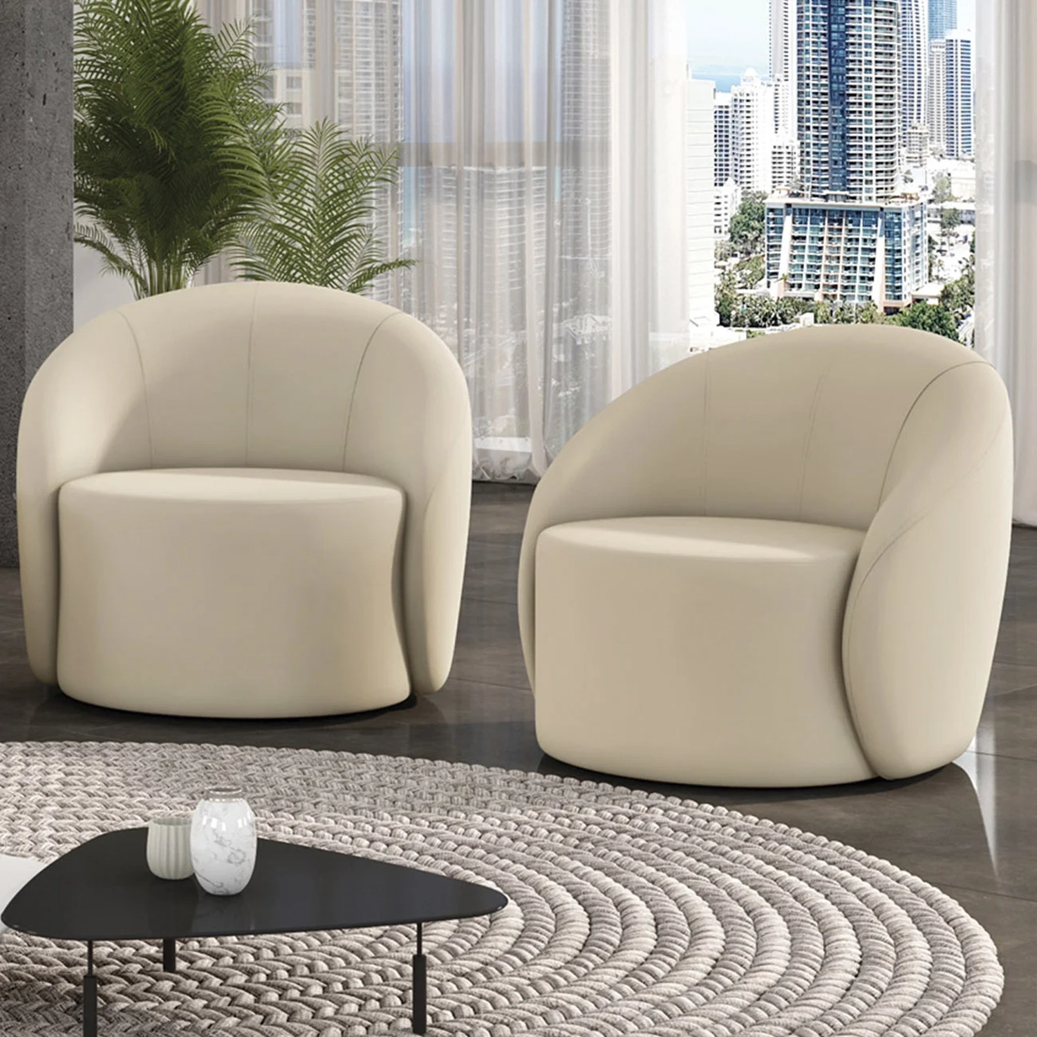 O design orgânico do kit 2 poltronas abraça o corpo com suavidade, enquanto o assento arredondado e costuras aparentes garantem charme para quem busca uma Poltrona Decorativa.