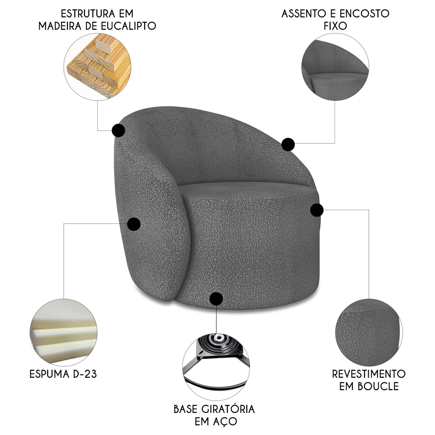 Poltrona Sala Giratória Redonda 91cm Steve Boucle Grafite I01 - Mpozenato