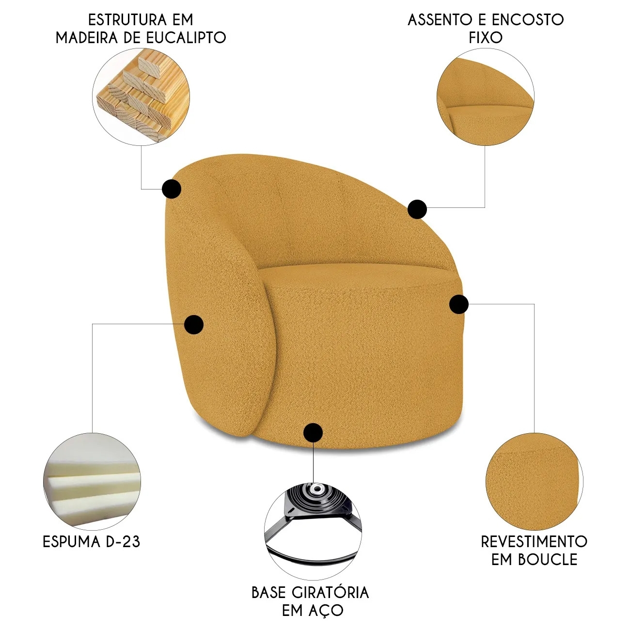 Poltrona Sala Giratória Redonda 91cm Steve Boucle Mostarda I01 - Mpozenato