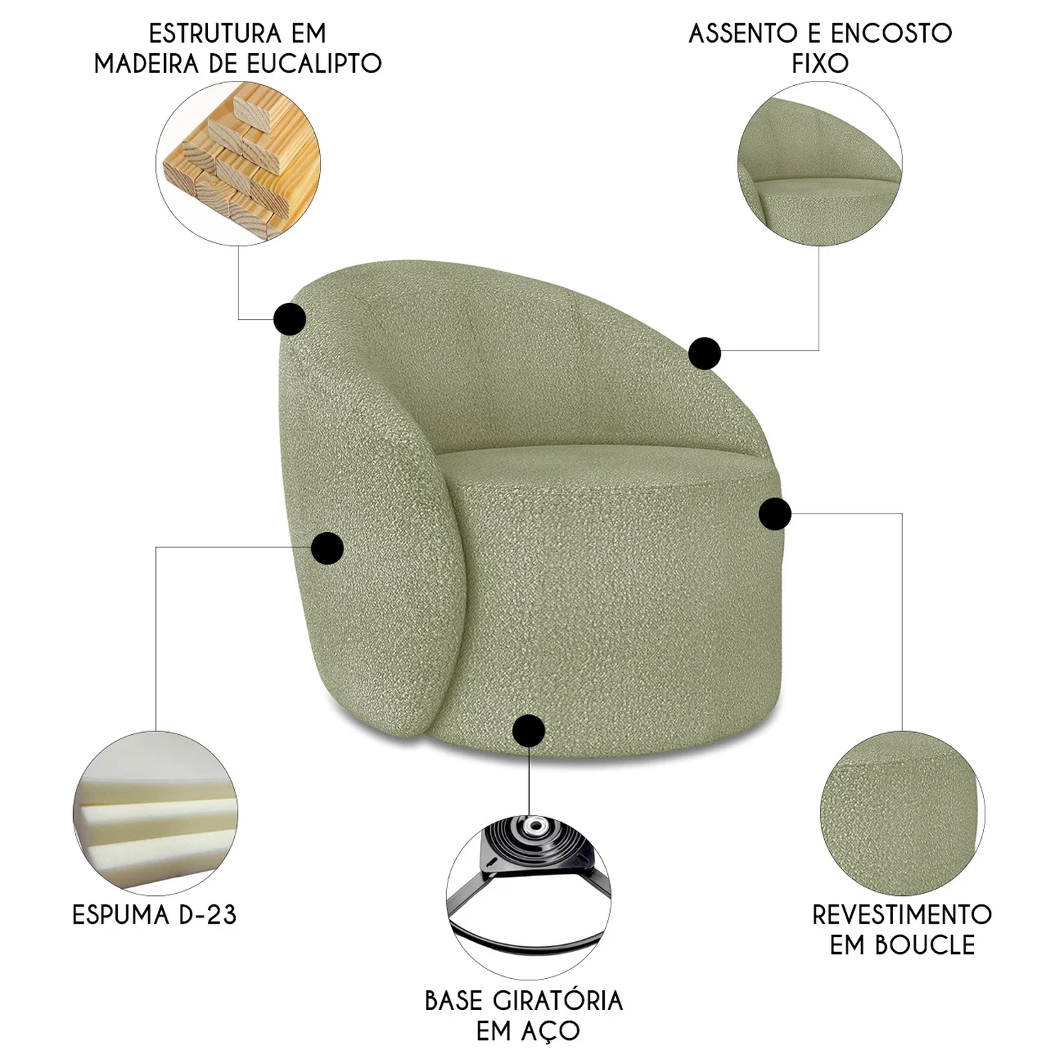 Poltrona Sala Giratória Redonda Kit 2 Steve Boucle Pistache I01 - Mpozenato