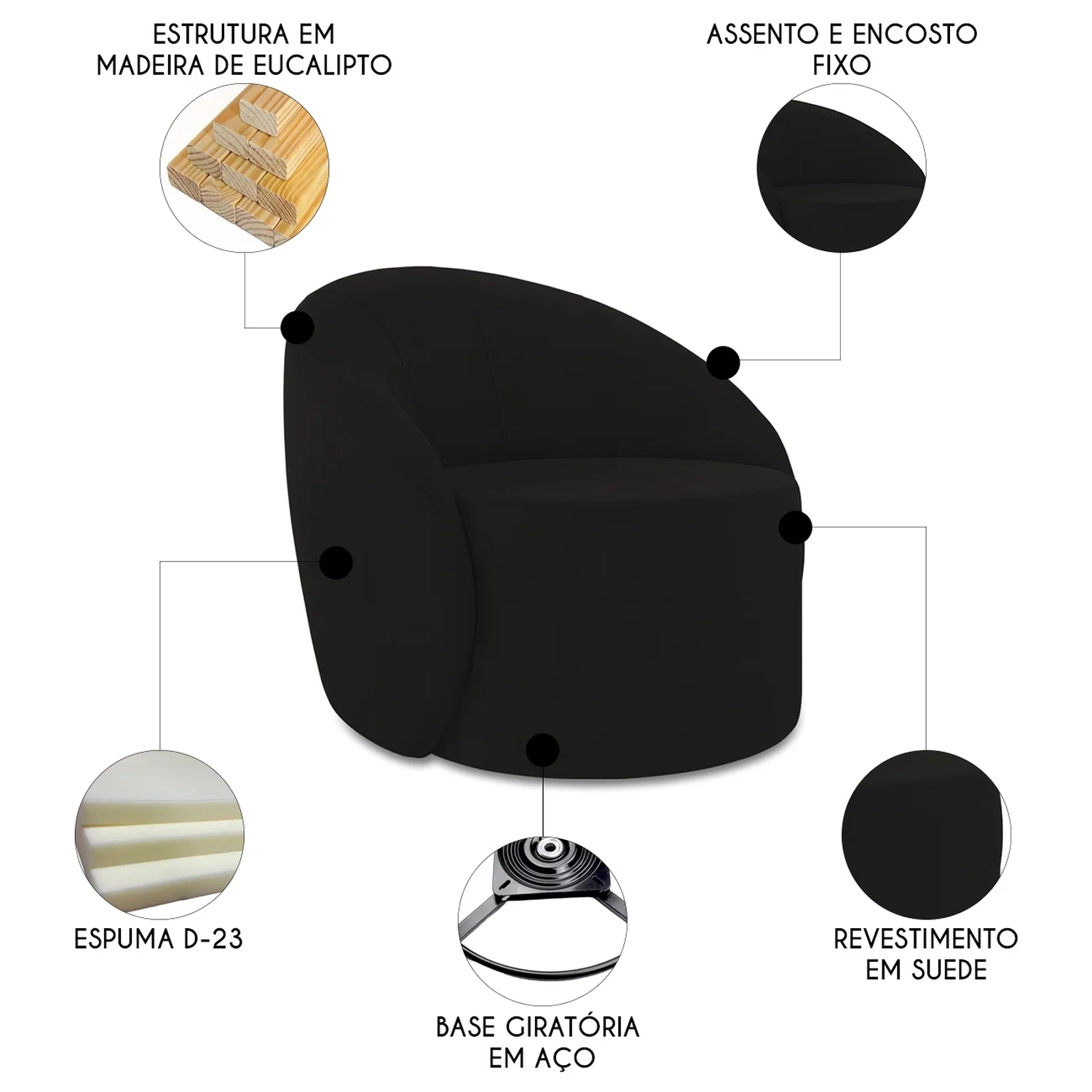 Poltrona Sala Giratória Redonda Kit 2 Steve Suede Preto I01 - Mpozenato