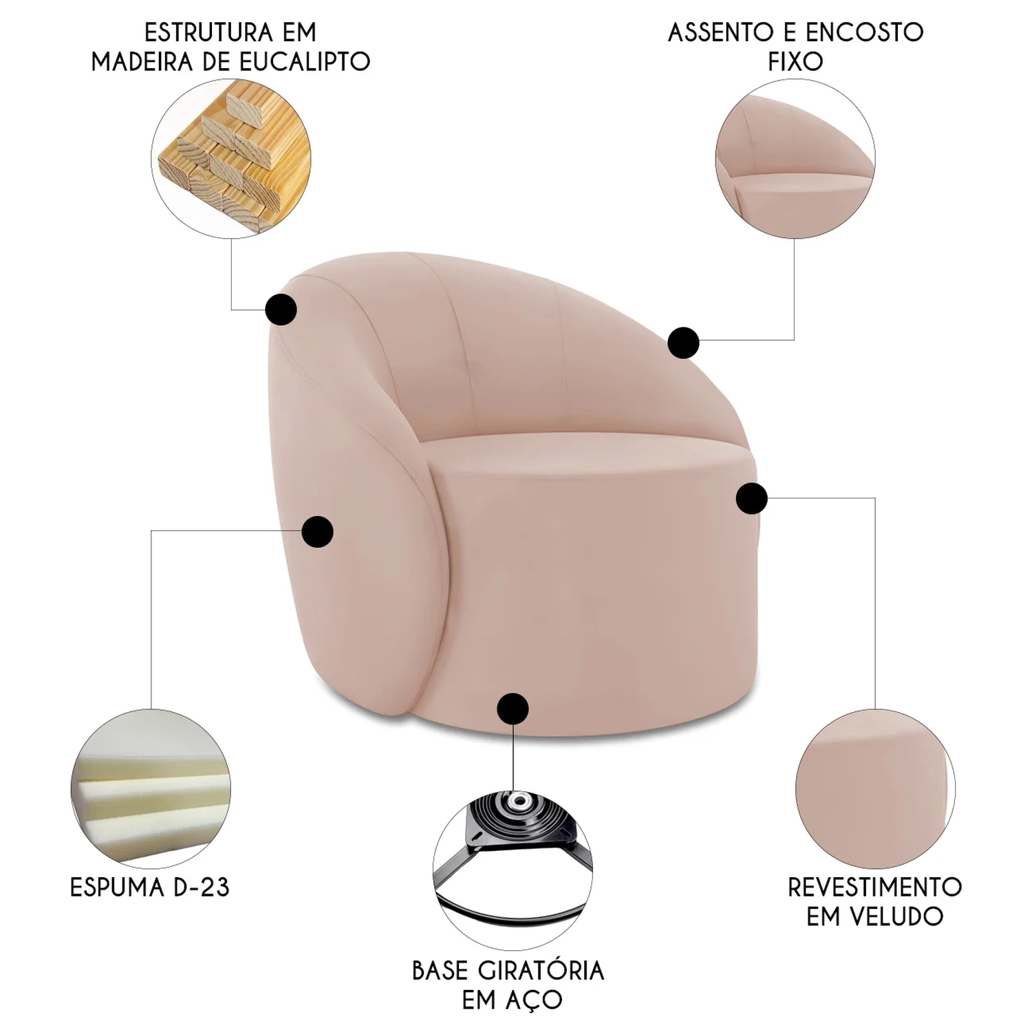 Poltrona Sala Giratória Redonda Kit 2 Steve Veludo Rose I01 - Mpozenato