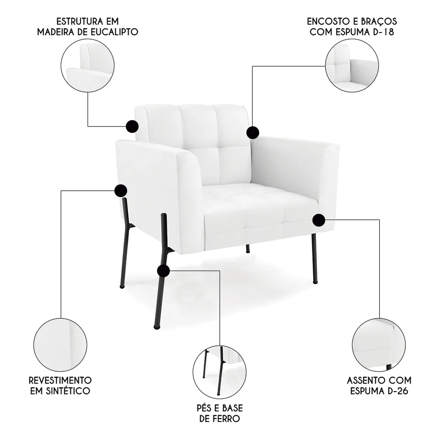 Material da Espuma: Assento D-26/ Encosto e braços D-18.