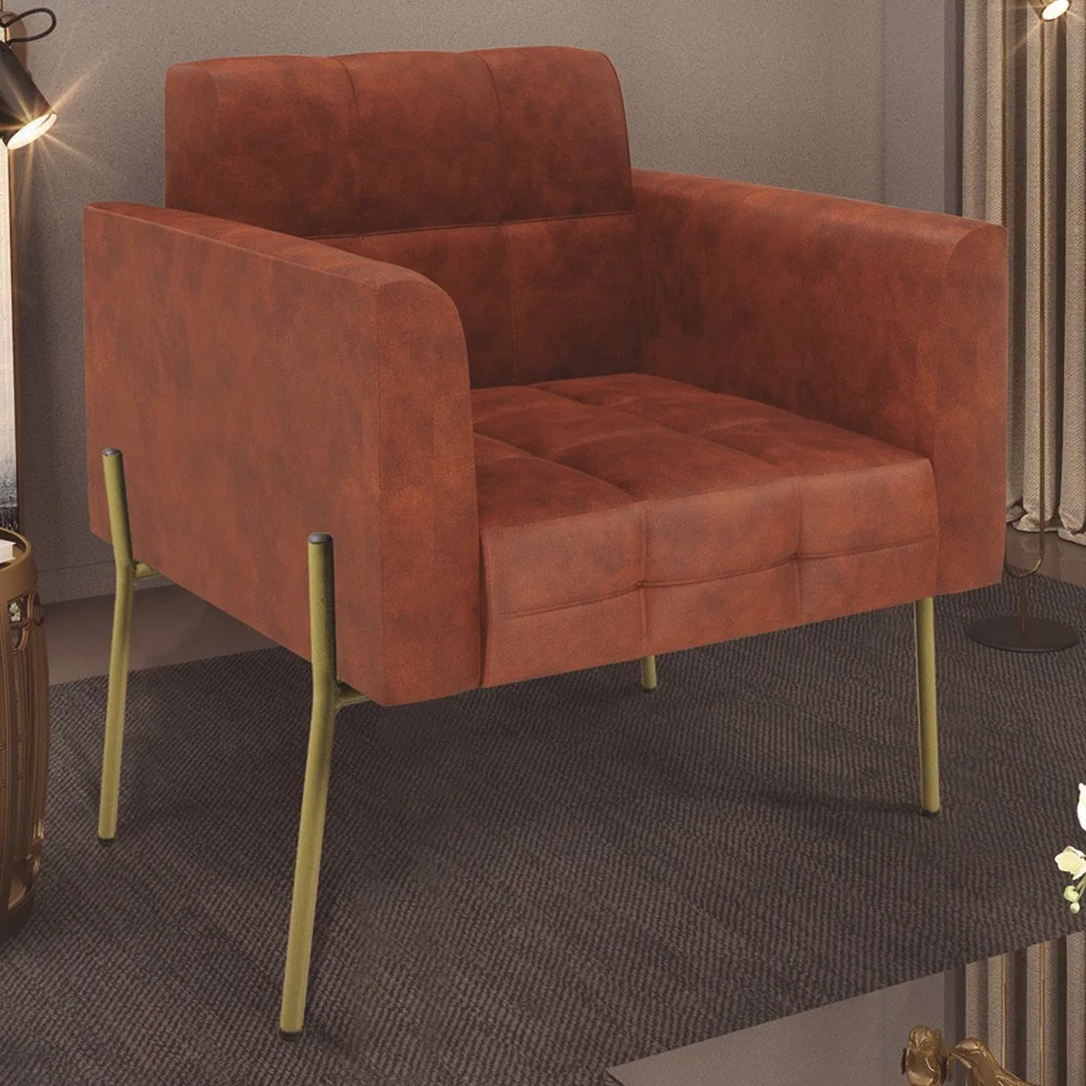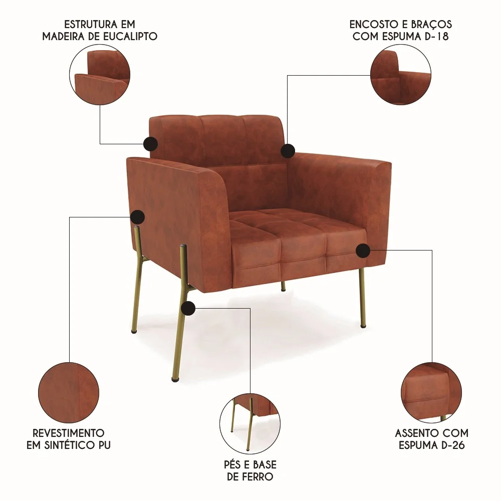 Você está procurando uma poltrona que combine com a sua Sala De Estar, recepção ou seu quarto, que ofereça conforto e qualidade? Então você vai adorar a Poltrona Para Sala Pés Metálicos Dourado Ana Sintético PU Nozes, da Ibiza!