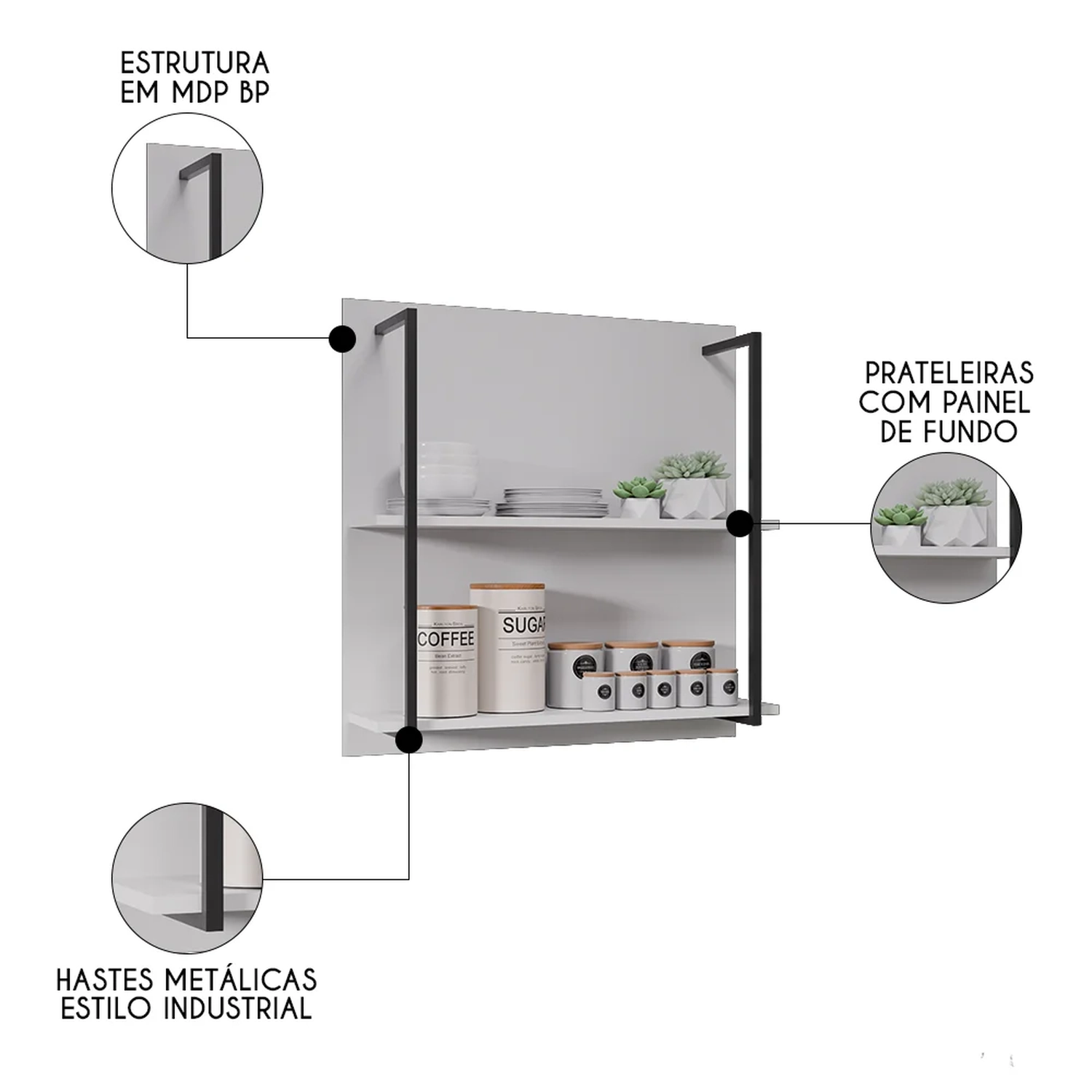 A Prateleira Industrial Cozinha Dupla com Painel Flora Z34 Branco, da Mpozenato, é uma excelente opção para você que quer organizar e decorar espaços com um toque moderno e único.