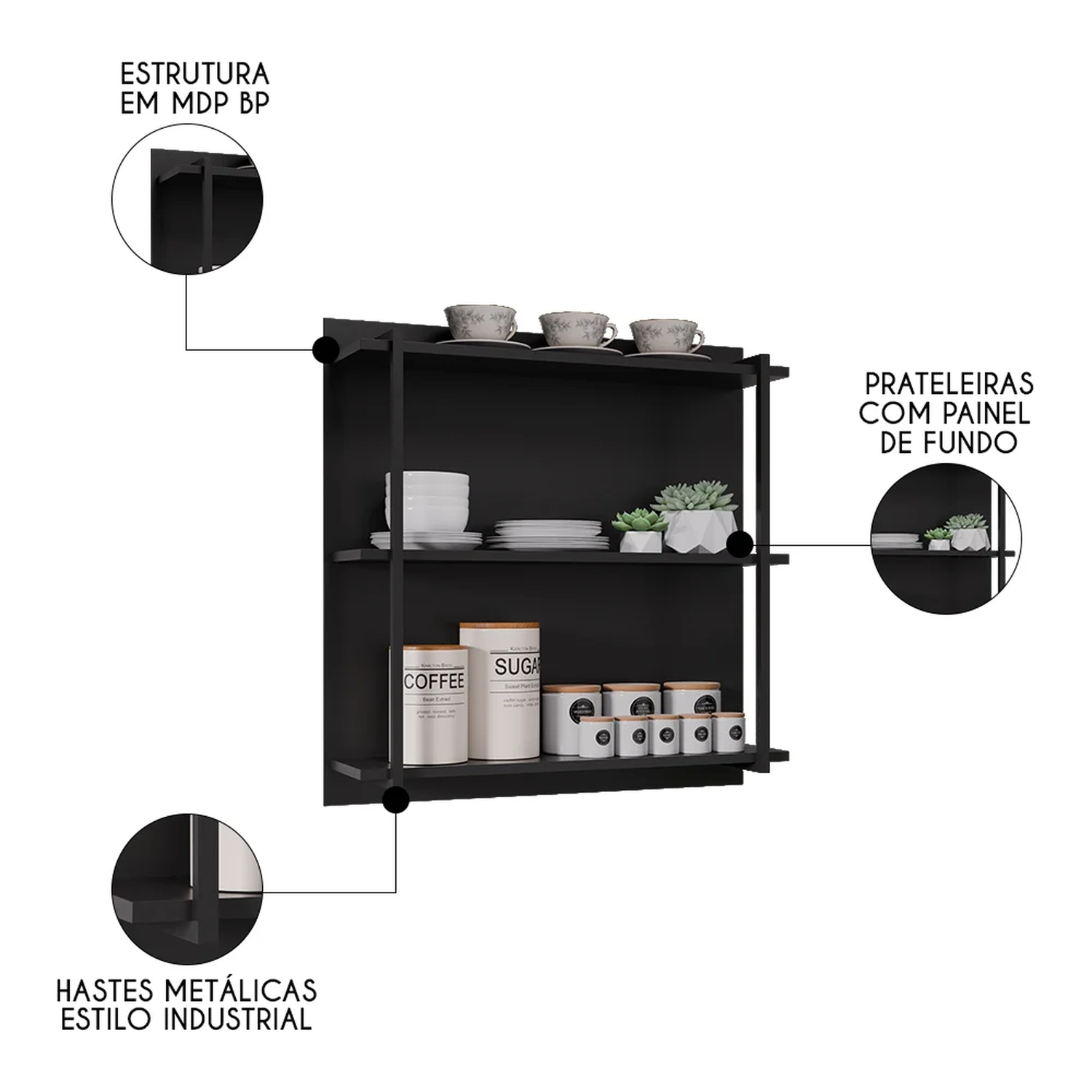 A Prateleira Industrial Cozinha Tripla com Painel Flora Z34 Preto, da Mpozenato, é uma excelente opção para você que quer organizar e decorar espaços com um toque moderno e único.