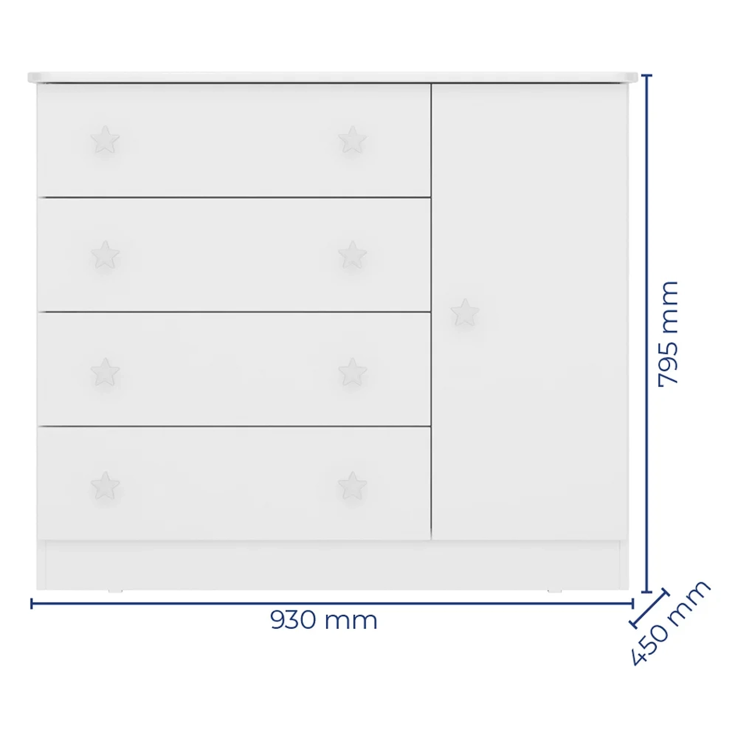 A cômoda conta com amplo espaço interno e puxadores em formato de estrela, ideais para manter o quarto de bebê sempre organizado e encantador.