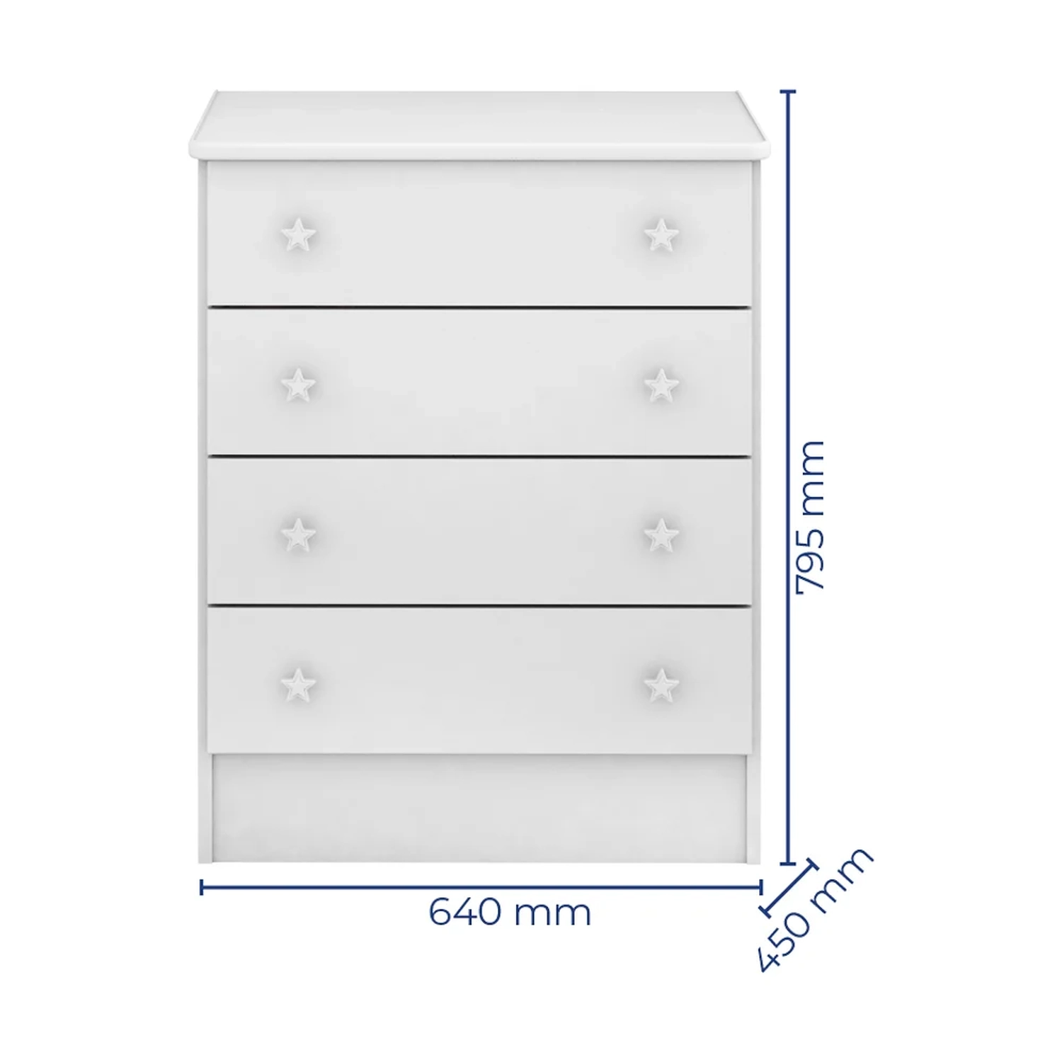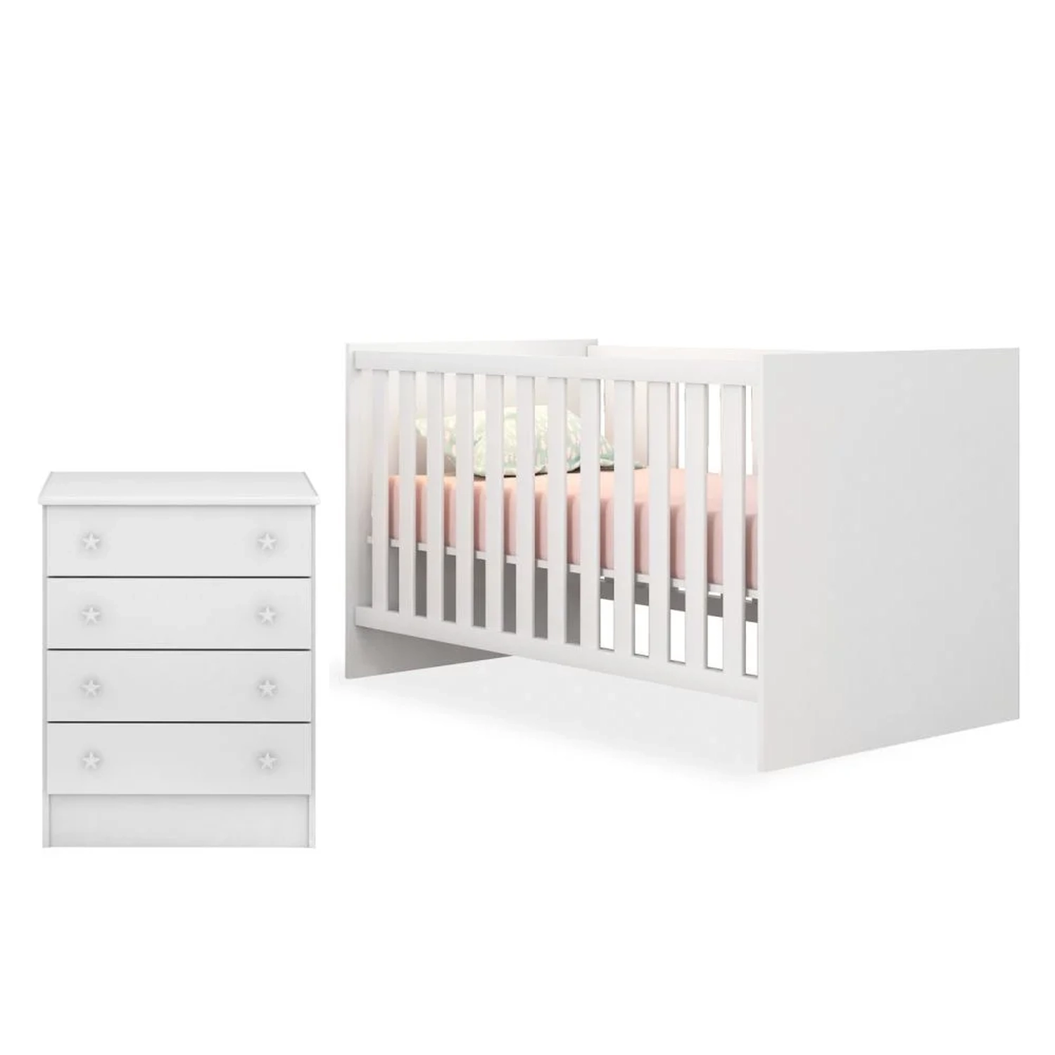 Fabricado em MDP e MDF, o conjunto oferece durabilidade e design encantador. A cômoda possui ótimo espaço interno e puxadores em formato de estrela que tornam o quarto de bebê ainda mais delicado.