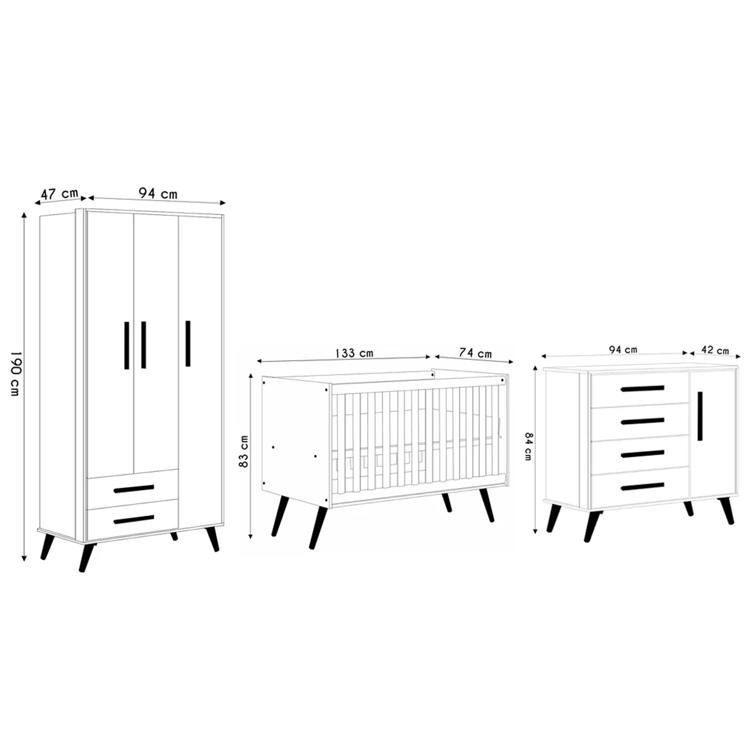 Conteúdo da embalagem: 1 Guarda Roupa / 1 Cômoda / 1 Berço.