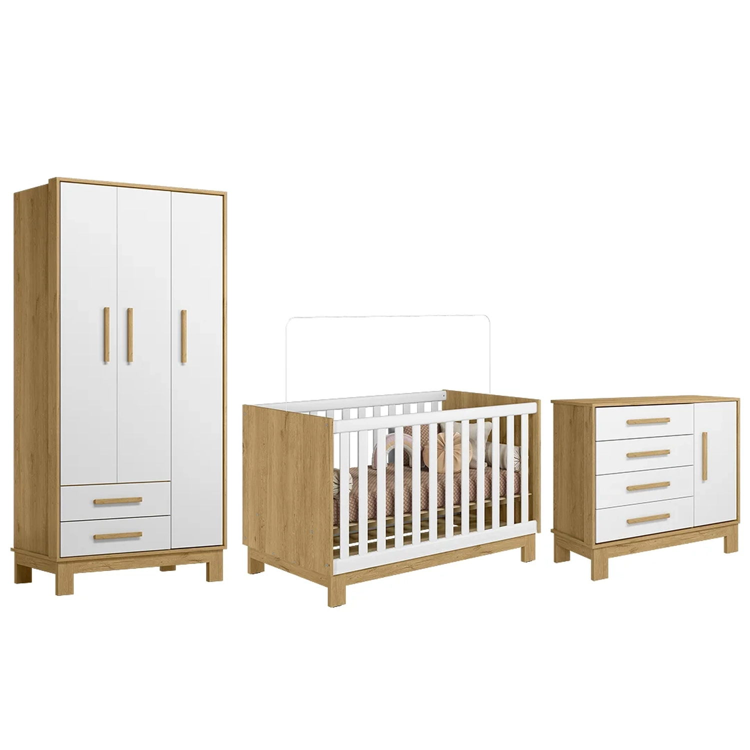 O Guarda Roupa 3 Portas oferece amplo espaço interno com divisórias bem distribuídas, ideal para organizar roupas e acessórios de forma eficiente. O design elegante adiciona um toque de sofisticação ao espaço, enquanto os detalhes cuidadosamente acabados garantem durabilidade e beleza. A Cômoda Infantil complementa o conjunto com quatro gavetas espaçosas, perfeitas para guardar desde roupas ou acessórios. Equipada com corrediças metálicas assim como o guarda roupa, proporciona um deslizar suave e silencioso, enquanto os puxadores de design moderno acrescentam um charme extra. O acabamento em pintura UV ressalta a cor, conferindo um aspecto vibrante e acolhedor ao ambiente. O Berço Padrão Americano, oferece conforto e segurança essencial para o bebê. O ajuste de altura do estrado em três níveis, com grade removível transformando o berço em mini cama que permite que os pais escolham a configuração ideal à medida que seu filho cresce. Além disso, a inclusão de um suporte para mosqueteiro oferece proteção adicional contra insetos, garantindo um sono tranquilo e sem interrupções para o bebê. O conjunto é perfeito para quem busca praticidade e estilo na decoração do quarto infantil, proporcionando um espaço organizado e acolhedor para o dia a dia.