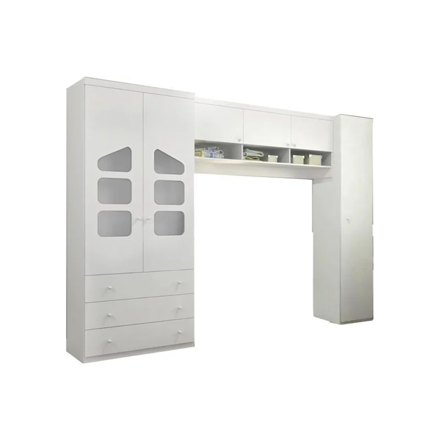 Conteúdo da Embalagem: 1 Guarda Roupa 2 portas, 1 Guarda Roupa 1 Porta, 1 Armário Aéreo.