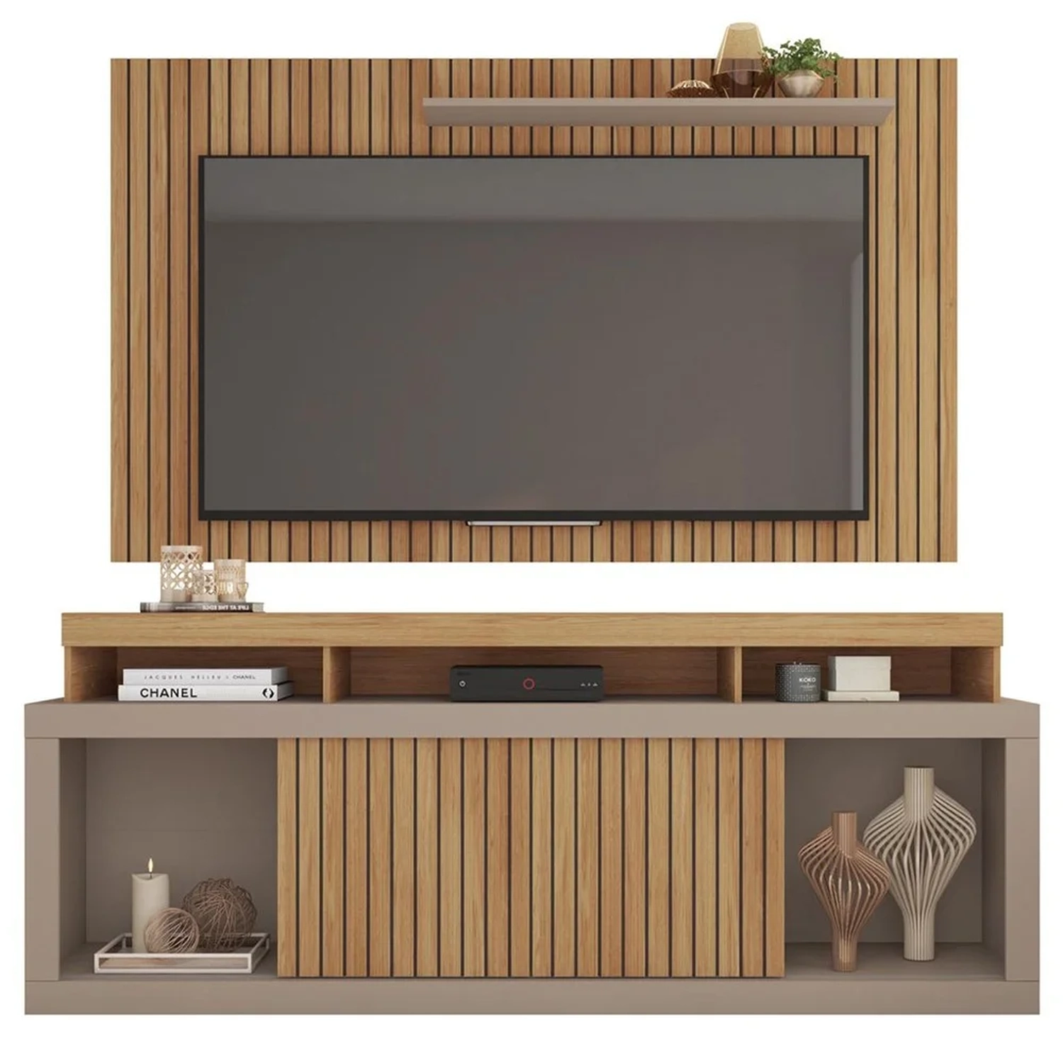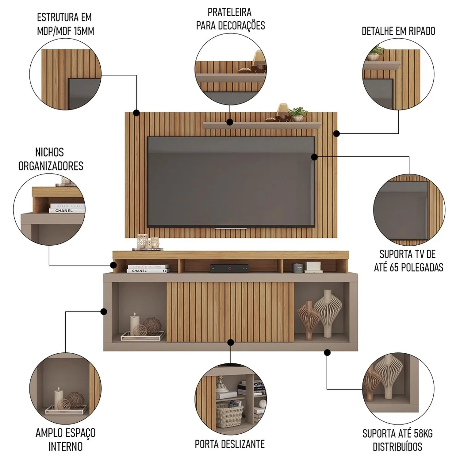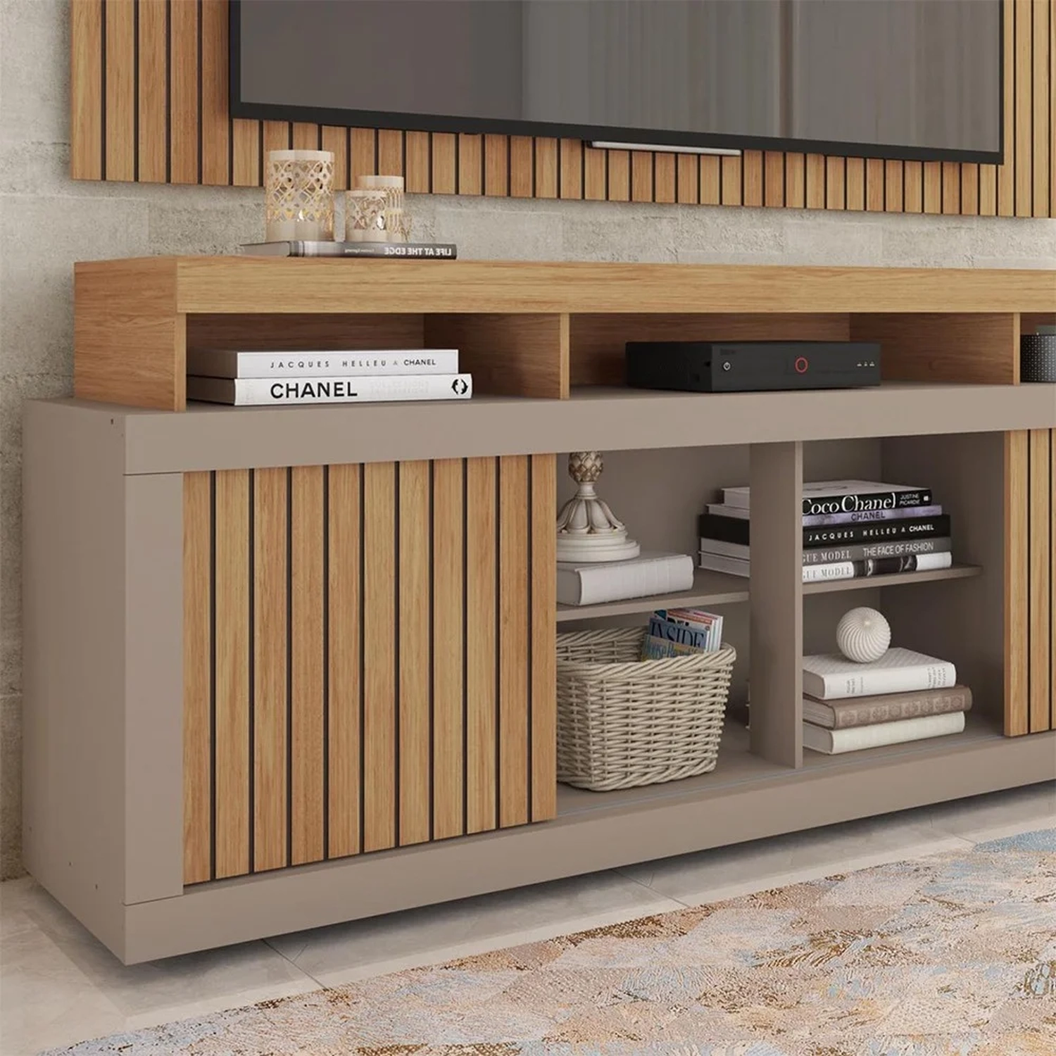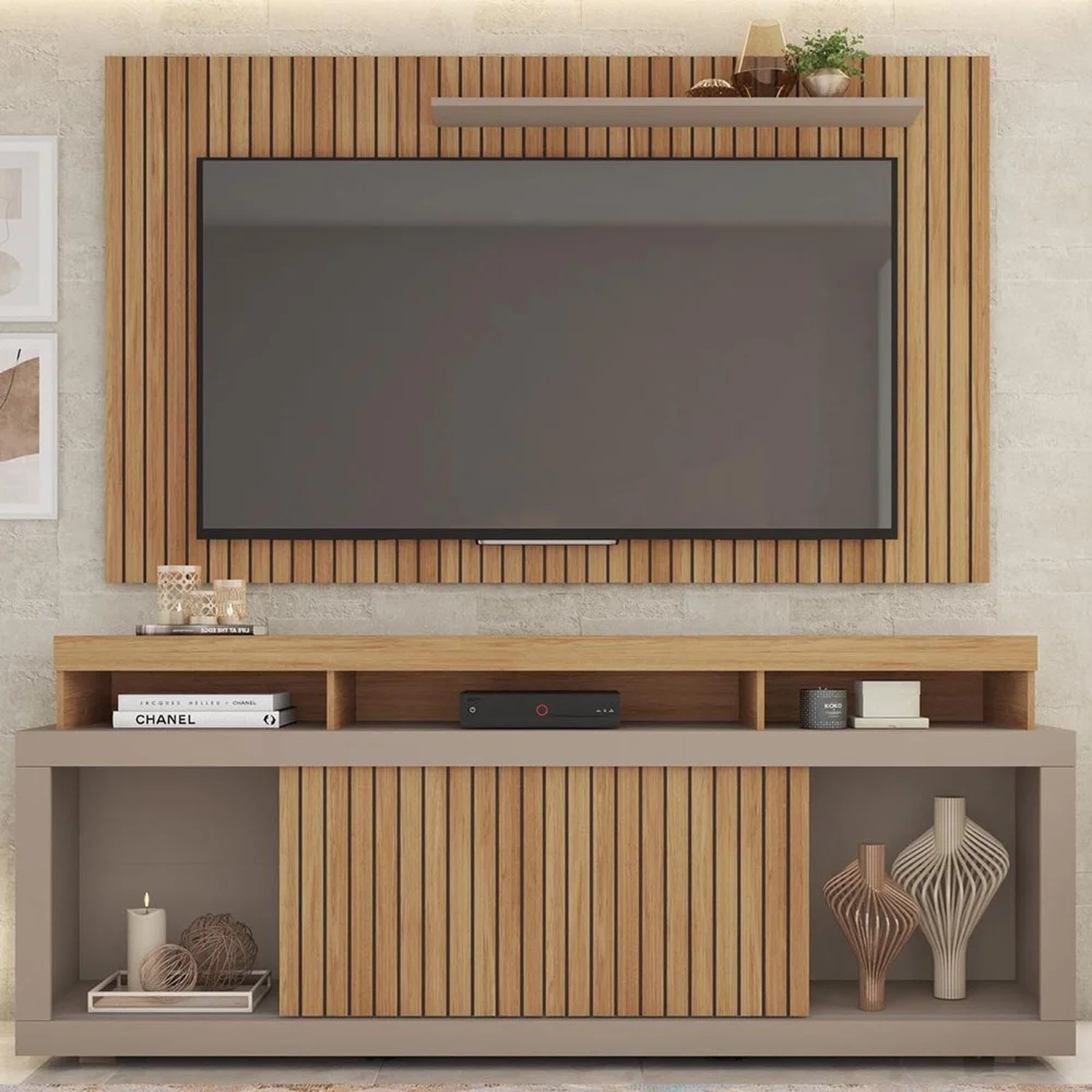 Ele possui duas portas deslizantes com detalhe ripado, que escondem um amplo espaço interno com uma prateleira, ideal para guardar objetos e acessórios. O Painel Para Tv tem detalhe ripado suporta TV de até 65 polegadas, a prateleira superior de 25mm confere mais robustez e charme ao móvel. O Rack Bancada é produzido em MDP e MDF de alta qualidade, com acabamento em pintura UV que garante maior durabilidade e resistência e conta com cinco nichos para eletrônicos e decorações. Sem dúvidas esse é o móvel que vai transformar a sua Sala De Estar!