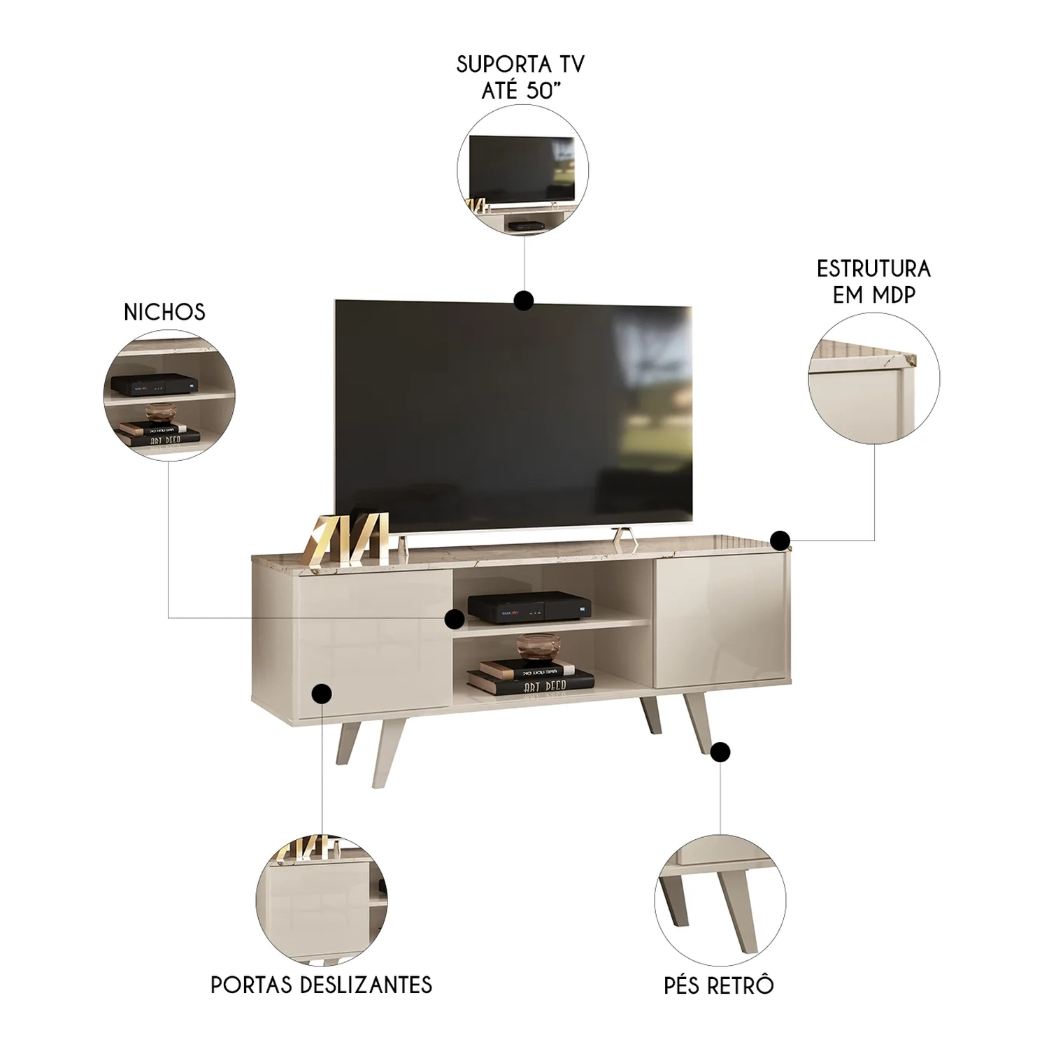 Com 2 portas deslizantes, o Rack de TV oferece fácil acesso ao espaço interno, enquanto as prateleiras e os 2 nichos garantem organização e funcionalidade para os seus itens. Seus pés usinados, no estilo retrô, conferem charme e estabilidade, elevando o visual do ambiente. Capaz de acomodar TVs de até 50 polegadas, esse Rack combina um design clean e elegante, perfeito para otimizar o espaço sem abrir mão da sofisticação.