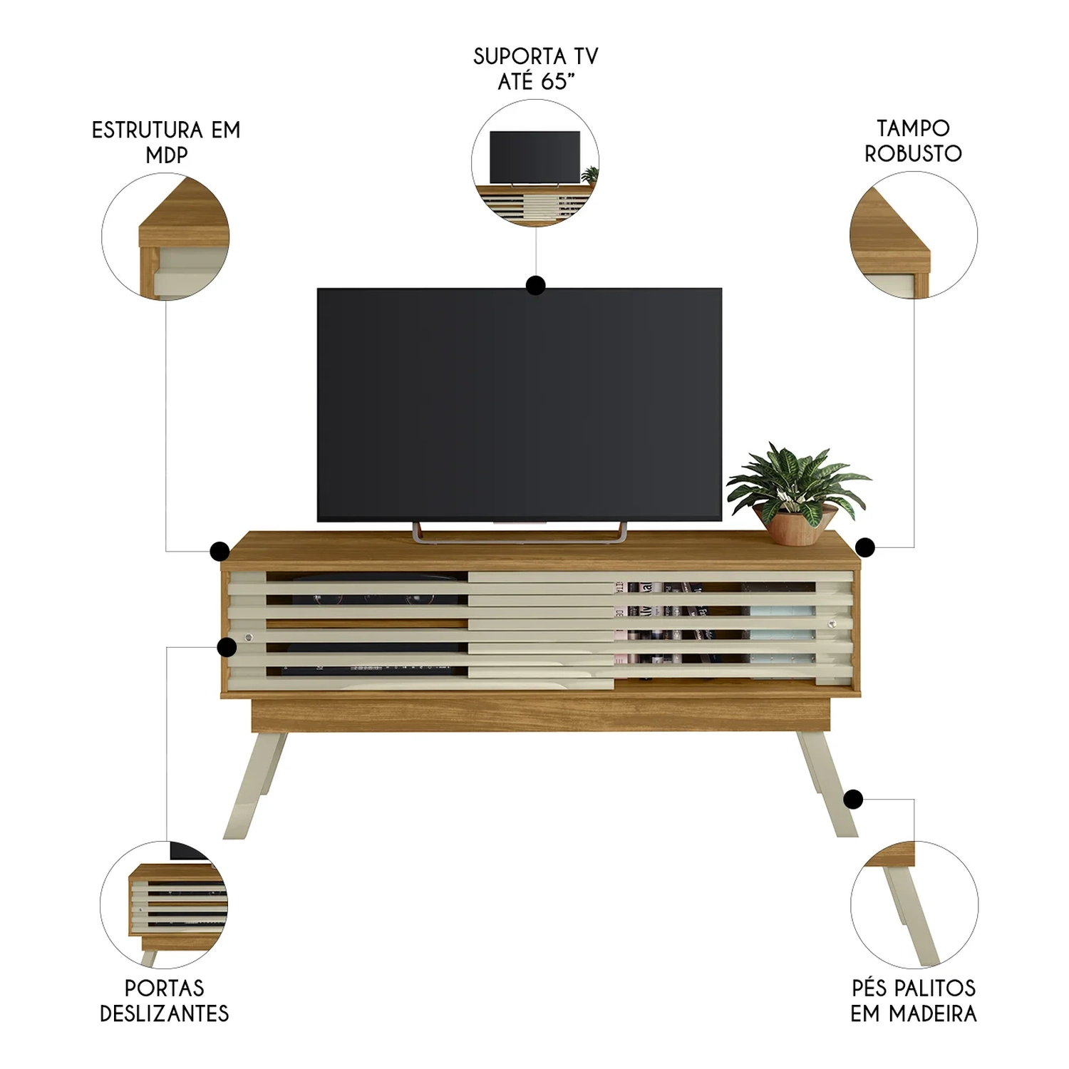 Com um design sofisticado, o Rack Para TV se destaca pelos pés palito e pelo tampo robusto de 25mm, proporcionando um visual refinado e ao mesmo tempo resistente. Seu estilo versátil se adapta perfeitamente a diferentes ambientes.