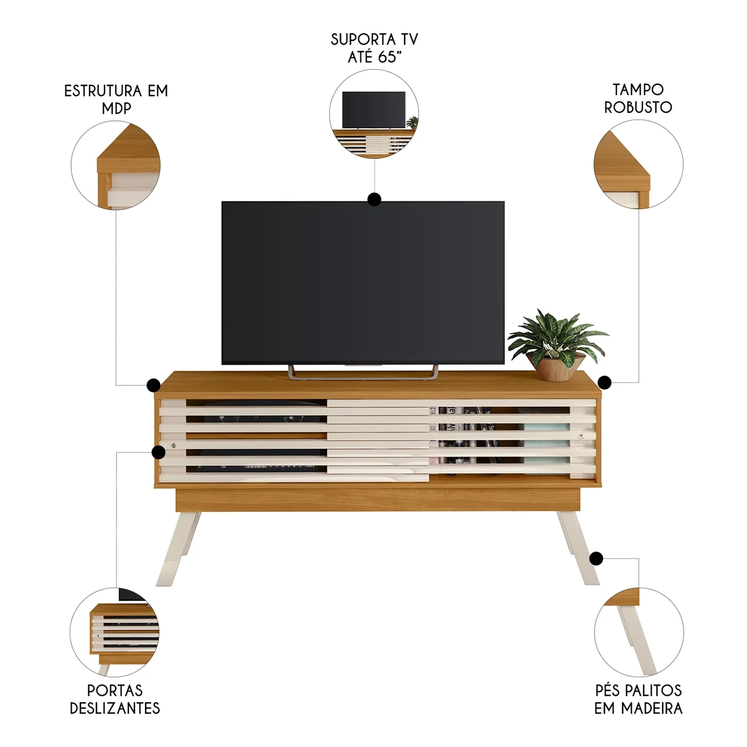 O Rack Bancada de TV 65 Pol 150cm Keli M01 Off/Cinamomo, da Mpozenato, combina elegância e funcionalidade para transformar sua Sala de Estar.