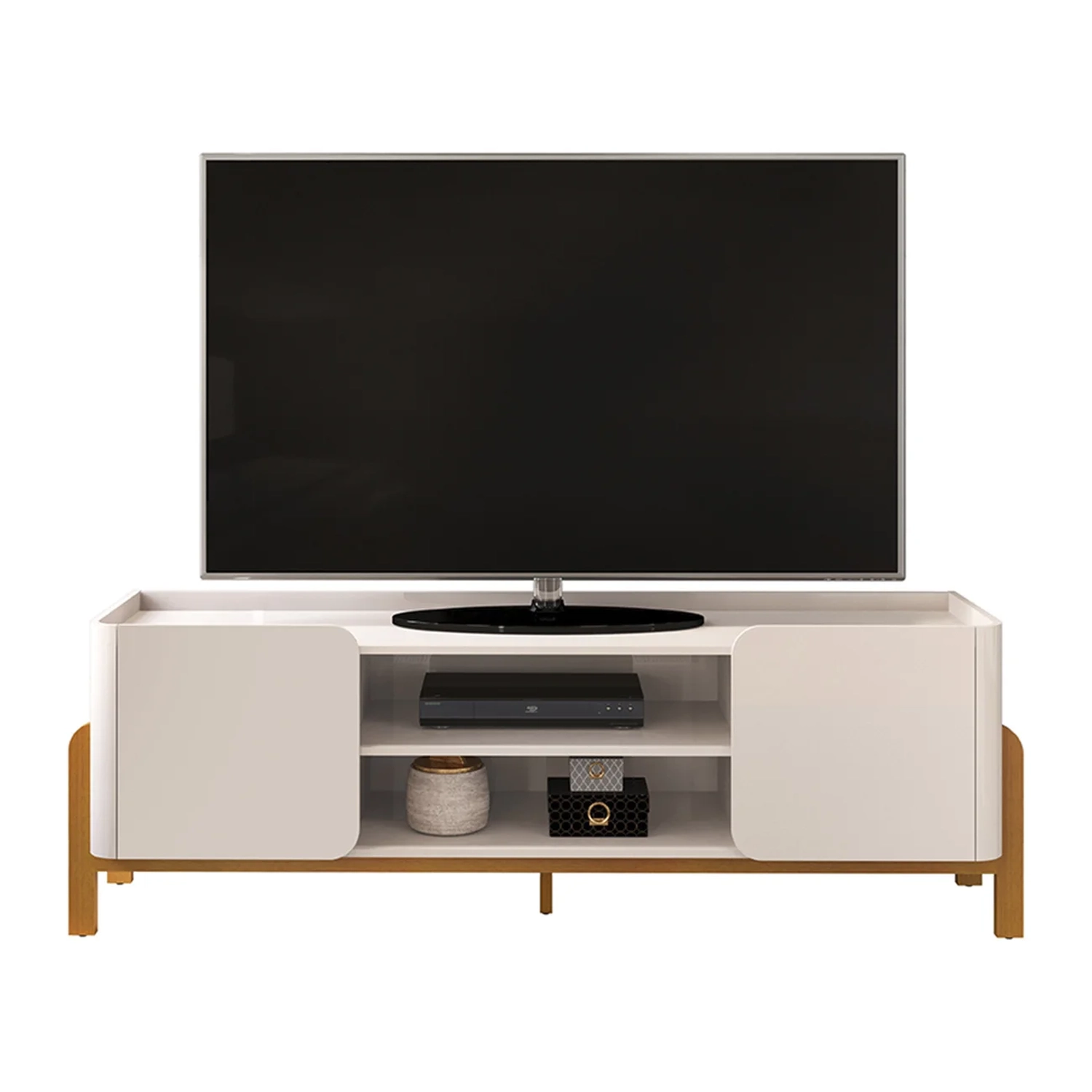 Seu tampo espaçoso, com cantos curvos e recuado para evidenciar as laterais e fundo, acomoda TVs de até 65 polegadas. A Bancada de TV alia praticidade e resistência. As cantoneiras curvas e as duas portas com cantos arredondados harmonizam-se de forma elegante, enquanto o amplo nicho central com prateleira oferece organização eficiente para aparelhos eletrônicos. Os pés em madeira maciça não apenas garantem robustez, como também adicionam um toque de sofisticação ao móvel. Pensando na funcionalidade, a Bancada de Madeira inclui um sistema de passa-fios para manter os cabos organizados e pés elevados que facilitam a limpeza, assegurando maior durabilidade. Produzida com madeira de reflorestamento e acabamento em pintura UV, é uma escolha sustentável e de alta qualidade.