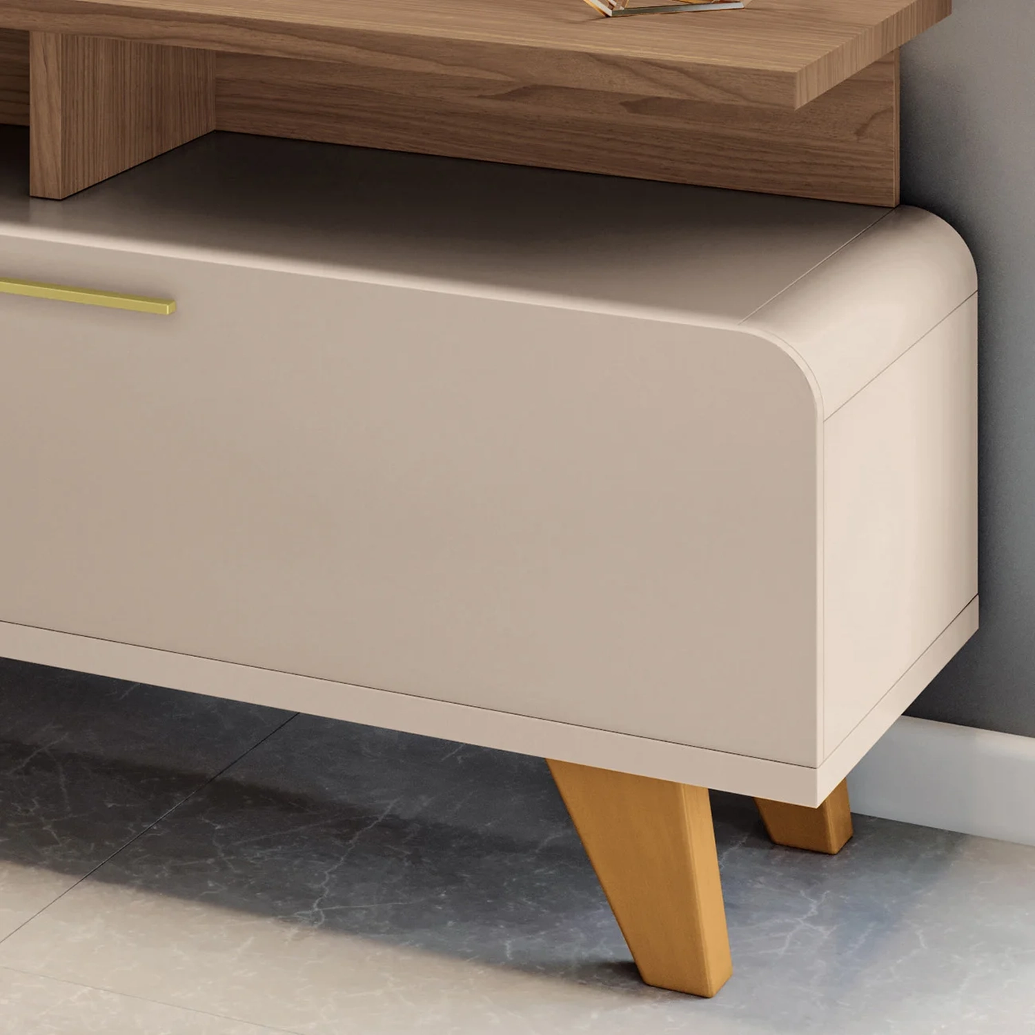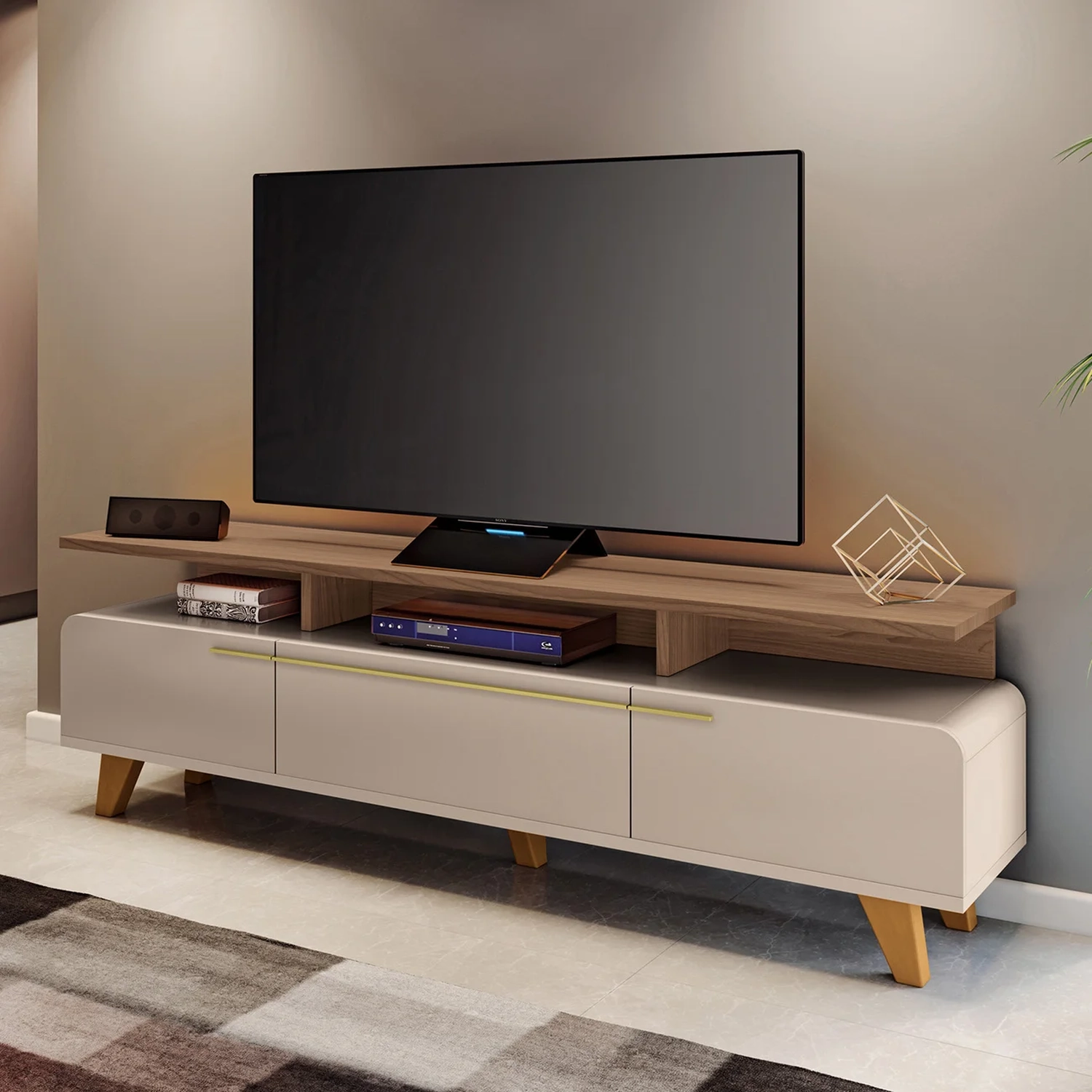 Seus cantos arredondados conferem um toque de suavidade e elegância, que é ideal para acomodar uma TV de até 70 polegadas sobre a sua base ampla e resistente, além disso abaixo do tampo conta com espaço para os eletrônicos. A Bancada Para Sala possui três portas basculantes com pistão a gás, que facilitam a abertura e o fechamento, além de garantir um espaço interno otimizado para guardar objetos e acessórios. Os puxadores metálicos em tom dourado contrastam com a cor neutra da bancada, criando um efeito visual de requinte e harmonia. Os pés de madeira maciça com acabamento envernizado proporcionam estabilidade e durabilidade ao Rack Para Sala, que é produzido em MDP e MDF de 25mm e 15mm, materiais de alta qualidade e ecologicamente corretos. Esta bancada é uma ótima opção para quem busca um móvel funcional, bonito e versátil para a sua Sala De Estar.