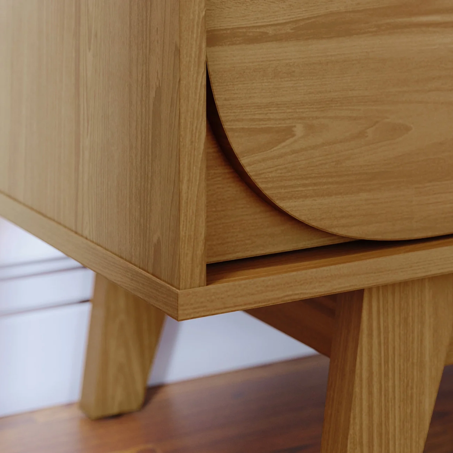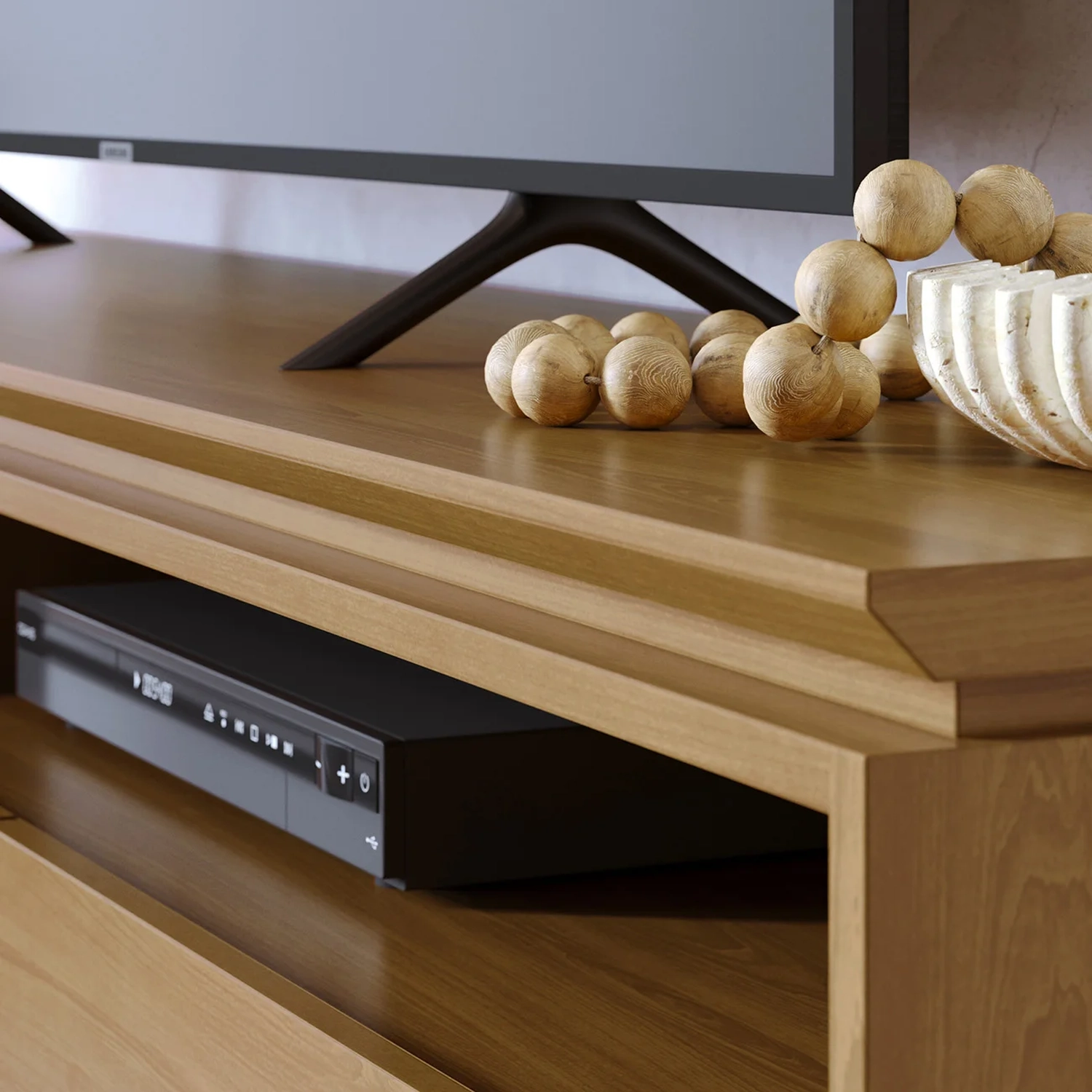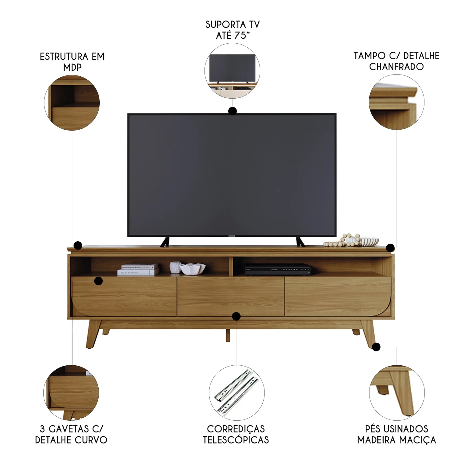 Com três gavetas equipadas com corrediças telescópicas, o Rack Para TV proporciona organização eficiente e abertura suave. As gavetas laterais contam com um sofisticado detalhe curvo, agregando um toque de elegância ao Rack Para sala. O tampo com 25mm de espessura e borda chanfrada, destaca-se pelo acabamento refinado e pela resistência. Produzida em MDP de 15 e 25 mm, a Bancada de TV conta com pés usinados que garantem estabilidade e um visual diferenciado, além de oferecer durabilidade e acabamento de alta qualidade.
