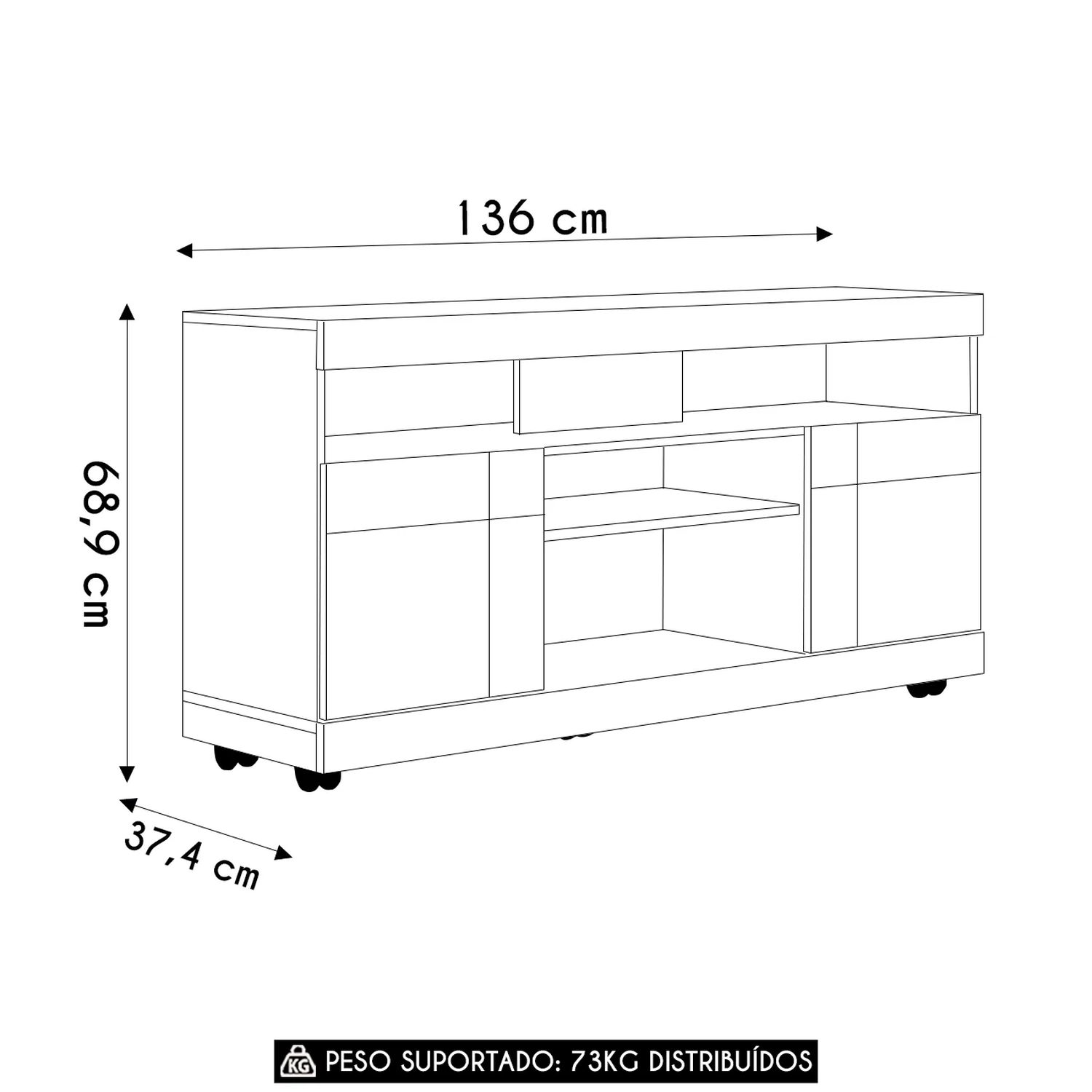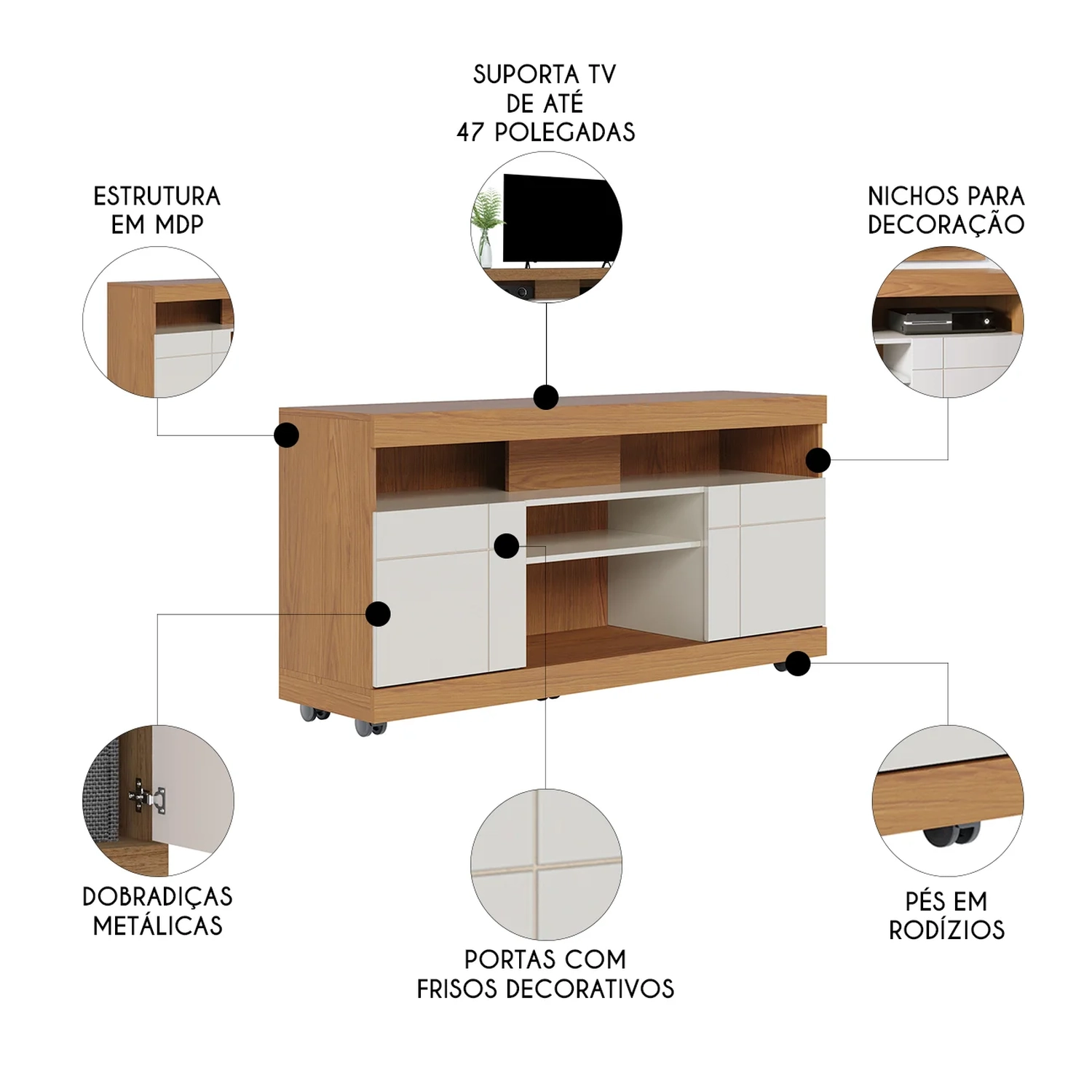 Os quatro nichos e a prateleira central formam uma composição visualmente agradável na Bancada, ideal para expor objetos decorativos, aparelhos eletrônicos, livros, porta-retratos e itens pessoais. Compatível com TVs de até 47 polegadas, o Rack oferece a melhor experiência de entretenimento. Além disso, acompanha rodízios para fácil movimentação.