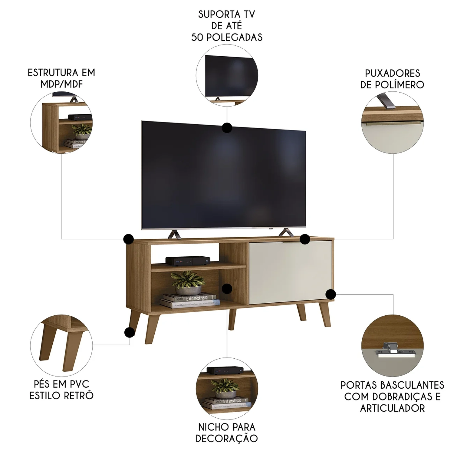 O Rack Para TV possui nichos decorativos ideal para exibir objetos de maneira estilosa e uma porta basculante com dobradiças metálicas e articulador para guardar itens de sua preferência. Sua estrutura oferece espaço adequado para manter tudo em ordem, sem comprometer a estética do ambiente.