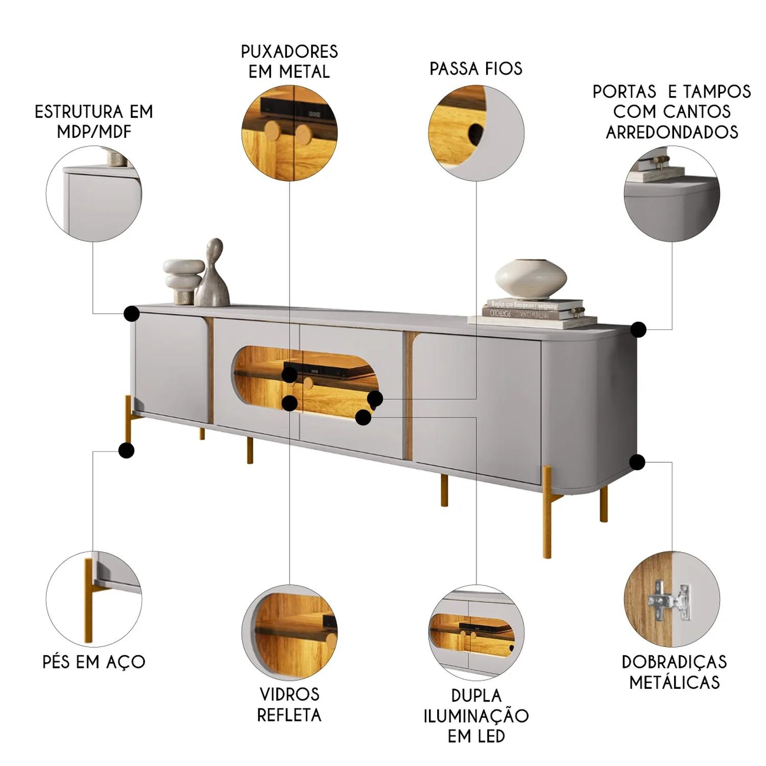 Um dos principais destaques Rack Para TV é a dupla iluminação em LED, que proporciona um efeito visual elegante e moderno, juntamente com os vidros reflecta, dá um toque a mais de sofisticação, criando uma atmosfera única e iluminada valorizando sua Sala de Estar.