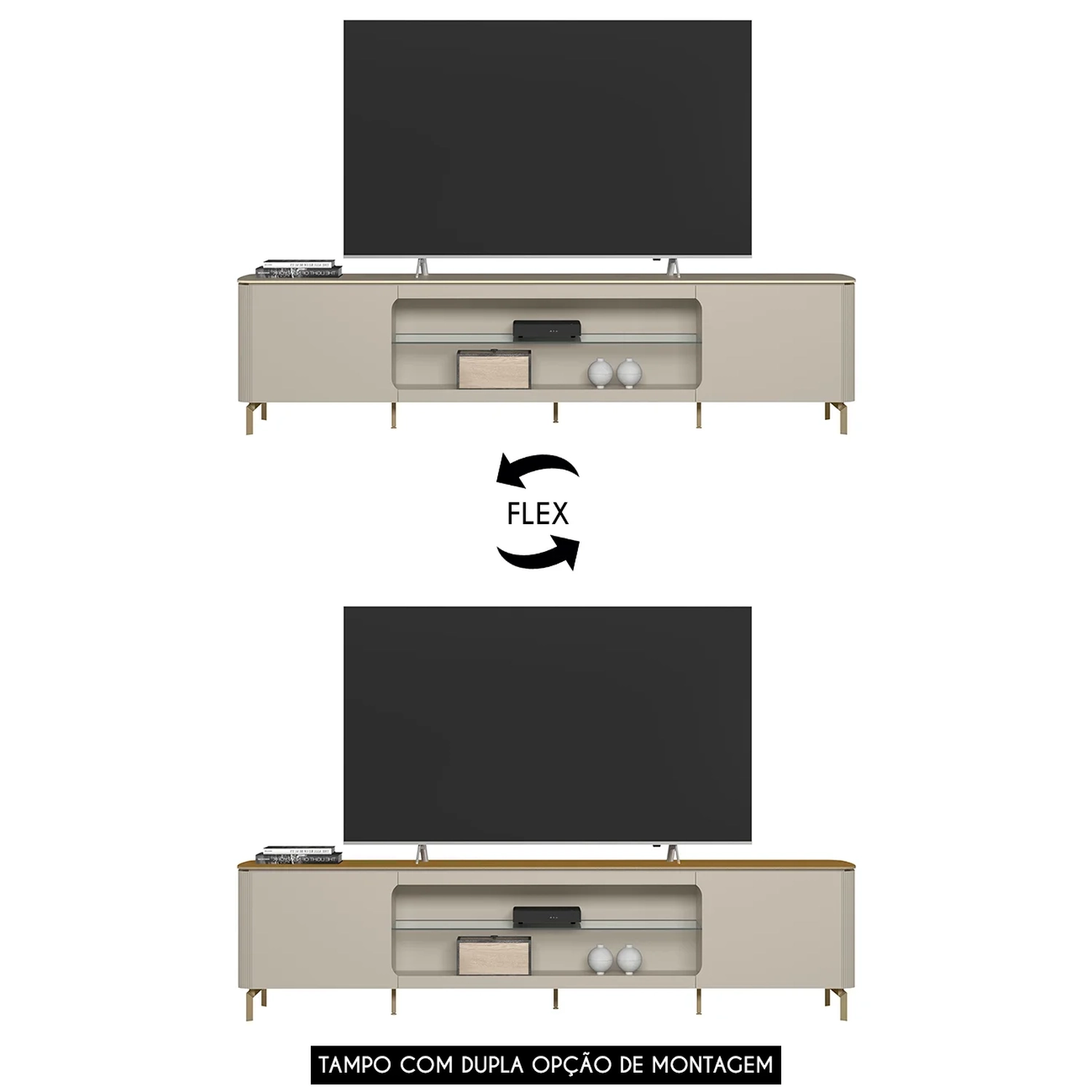 Outro destaque da Bancada Para TV são seus pés em metal dourado, que conferem um toque de requinte e luxo à peça. Essa combinação de materiais, como o metal e o vidro, proporciona não apenas um design moderno, mas também um toque de sofisticação que agrada aos mais exigentes. O acabamento do tampo cor flex adiciona mais personalidade, podendo escolher a cor que combina com a sua decoração.