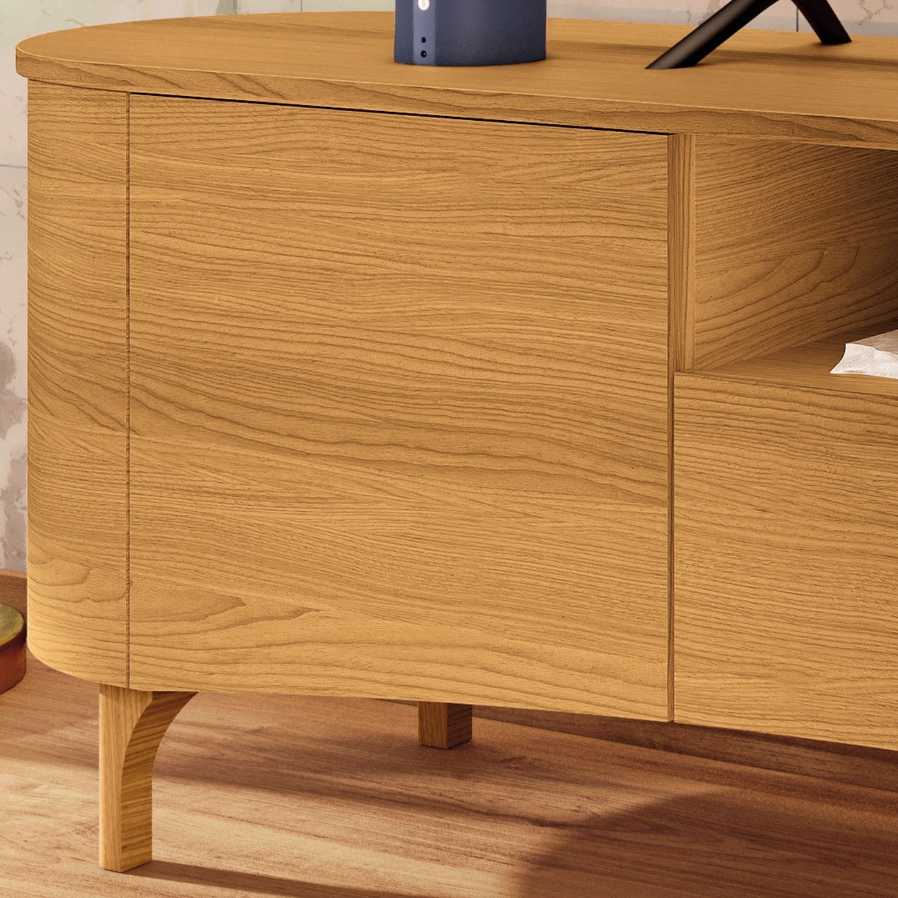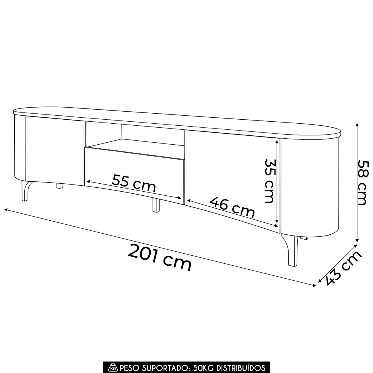 Os cantos com formato curvo e as portas com dobradiças laterais reforçam o visual moderno, enquanto a gaveta central com corrediças telescópicas garante praticidade no uso diário do Móvel Para Sala.