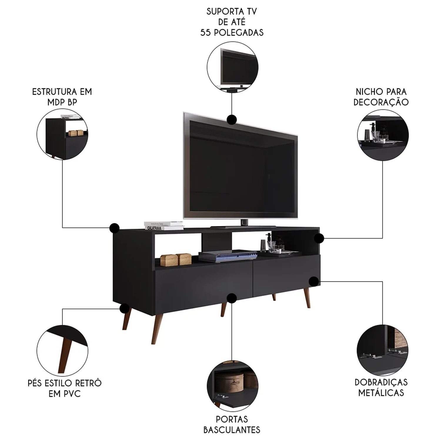 Feito com todo carinho e matéria-prima de qualidade ecologicamente correta, esse rack estilo retrô será o verdadeiro símbolo de beleza e funcionalidade do seu ambiente. Isso porque, além do espaço generoso para acomodar TVs de até 55 polegadas, ele também possui amplo nicho para que você possa exibir seus objetos decorativos favoritos, seus livros mais amados ou até mesmo instalar os demais aparelhos eletrônicos. E para deixar tudo ainda mais charmoso e prático, as duas portas basculantes adicionam o toque final de elegância ao seu ambiente, mantendo os objetos bem guardados e a bancada livre de bagunças.