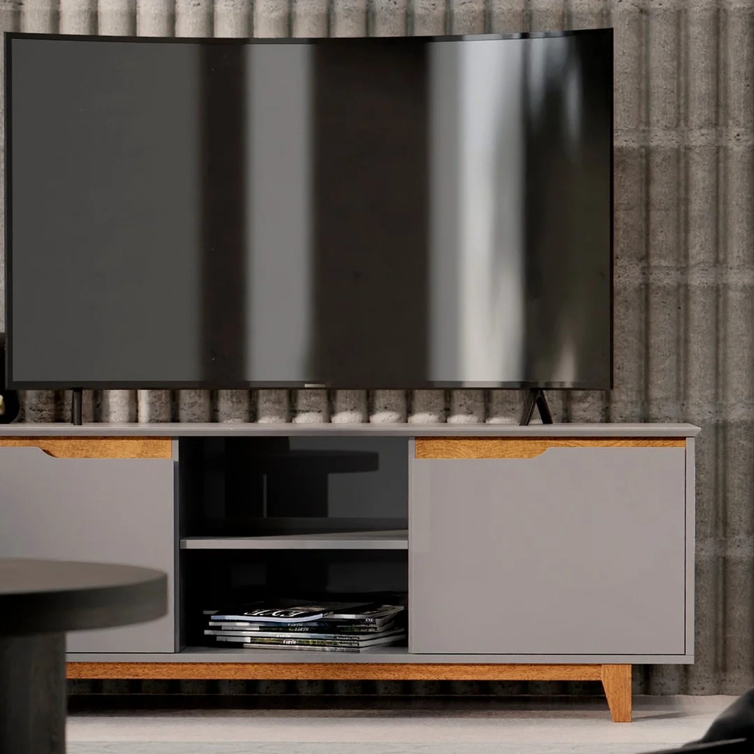 Transforme sua sala em um espaço de entretenimento e estilo com o Rack para Sala Bancada de TV 55 Pol 139cm Flow Cinza, da EJ Móveis!