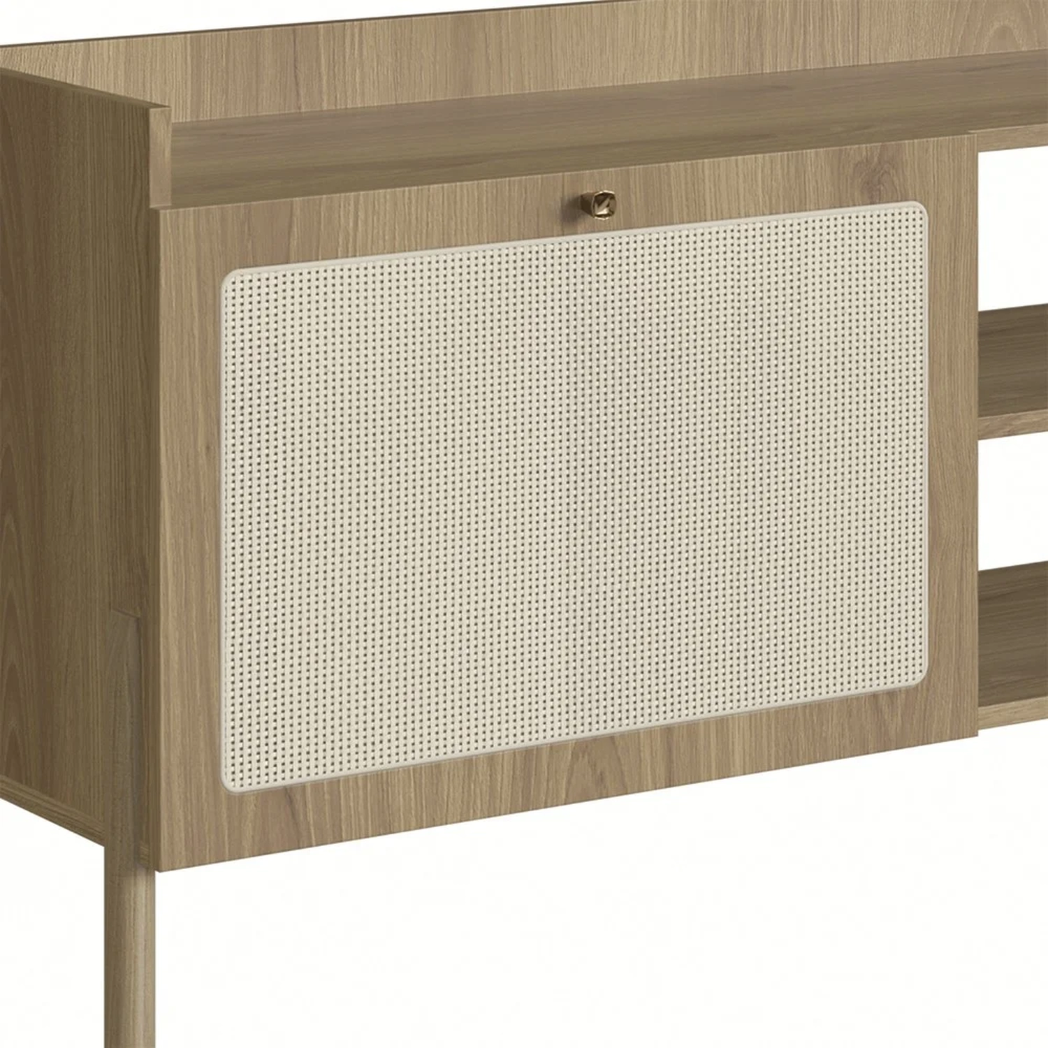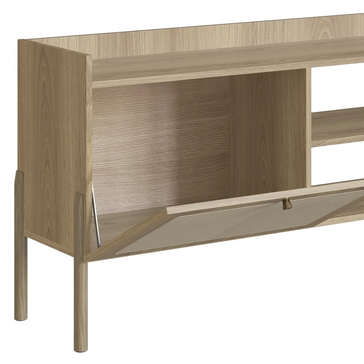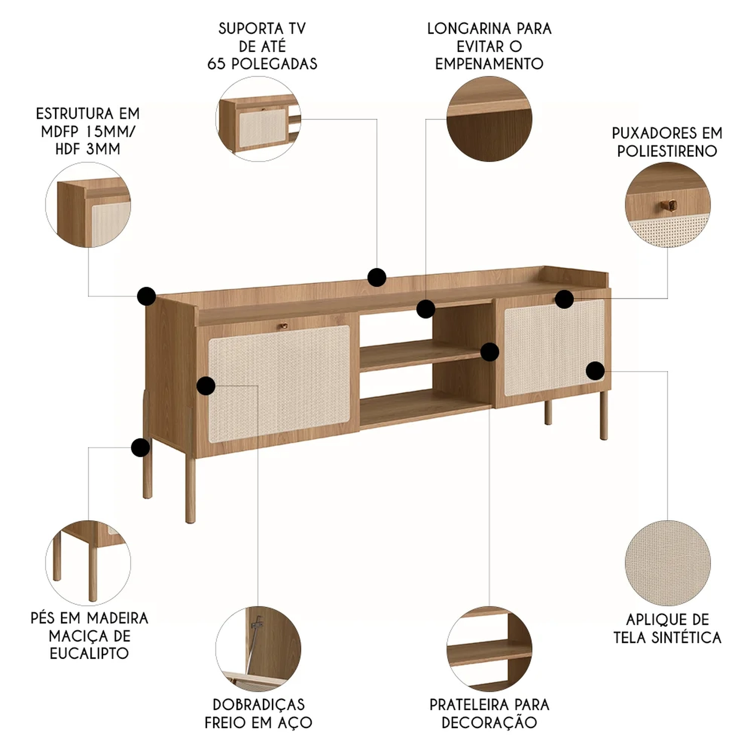 Com design orgânico e inovador, esse Rack para TV com pés de madeira maciça promete um visual elegante para sua sala. Além de ter capacidade para receber televisores de até 65 polegadas, essa Bancada Para Sala ainda conta com duas portas, com abertura em 90°, dobradiças e freio metálicos com proteção anticorrosão e excelente compartimento interno, ideal para armazenar os mais diversos itens e, assim, deixar o tampo livre de bagunças. Mas além da funcionalidade, esse rack também será o ícone decorativo do seu ambiente; afinal, conta com detalhe em tela sintética fixada nas portas que expressa charme e cuidado.