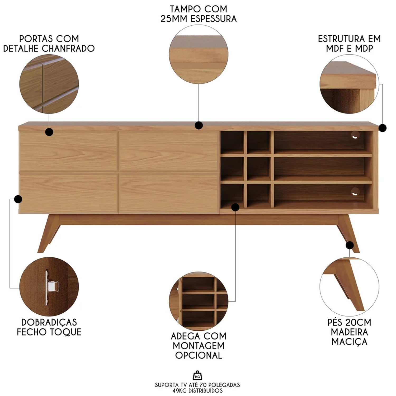 O tampo resistente de 25mm é perfeito para acomodar uma TV de até 70 polegadas, como também pode servir de apoio para livros, objetos decorativos e aparelhos eletrônicos. Já as duas portas com sistema de abertura fecho toque detalhes chanfrados agregam ainda mais estilo, assim como preservam os objetos que podem ser armazenados na parte interna. Além disso, esse rack bancada conta com dois tipos de nichos, os maiores para aparelhos eletrônicos e os menores, classificados como nicho adega e comportam até 06 garrafas. Ah, mas se essa funcionalidade não faz sentido para você, fique tranquilo, pois a montagem é opcional e você ganhará espaço extra.