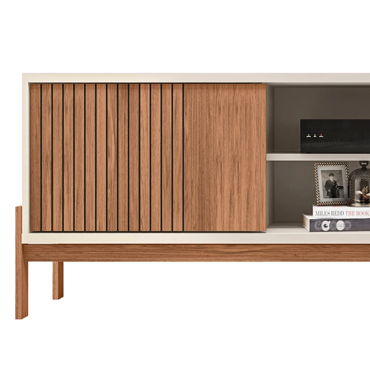 Eleve o conceito de estilo e funcionalidade na decoração da sua sala de estar com o Rack Para Sala Bancada de TV 72 Pol Ripado 184cm Tannen Freijó/Off White, da Caemmun.
