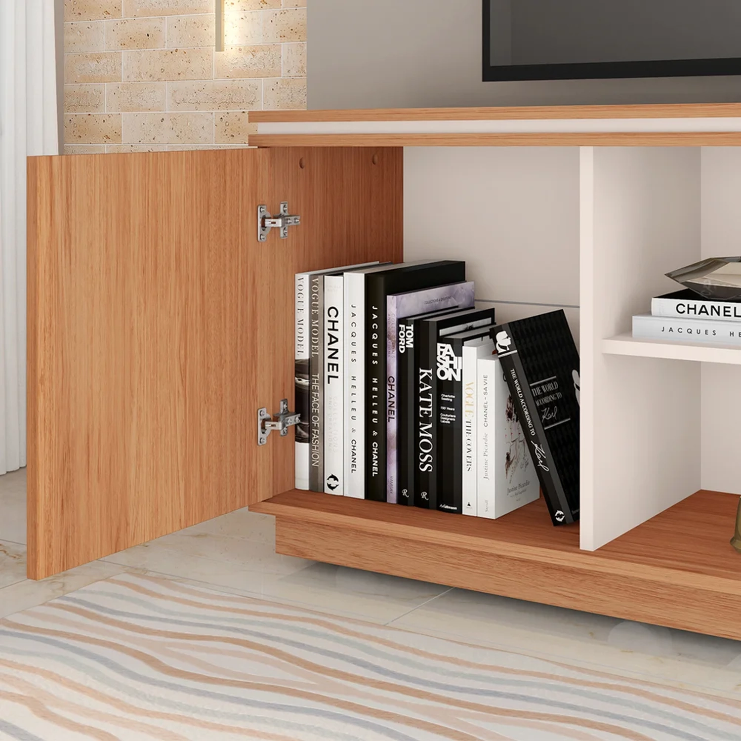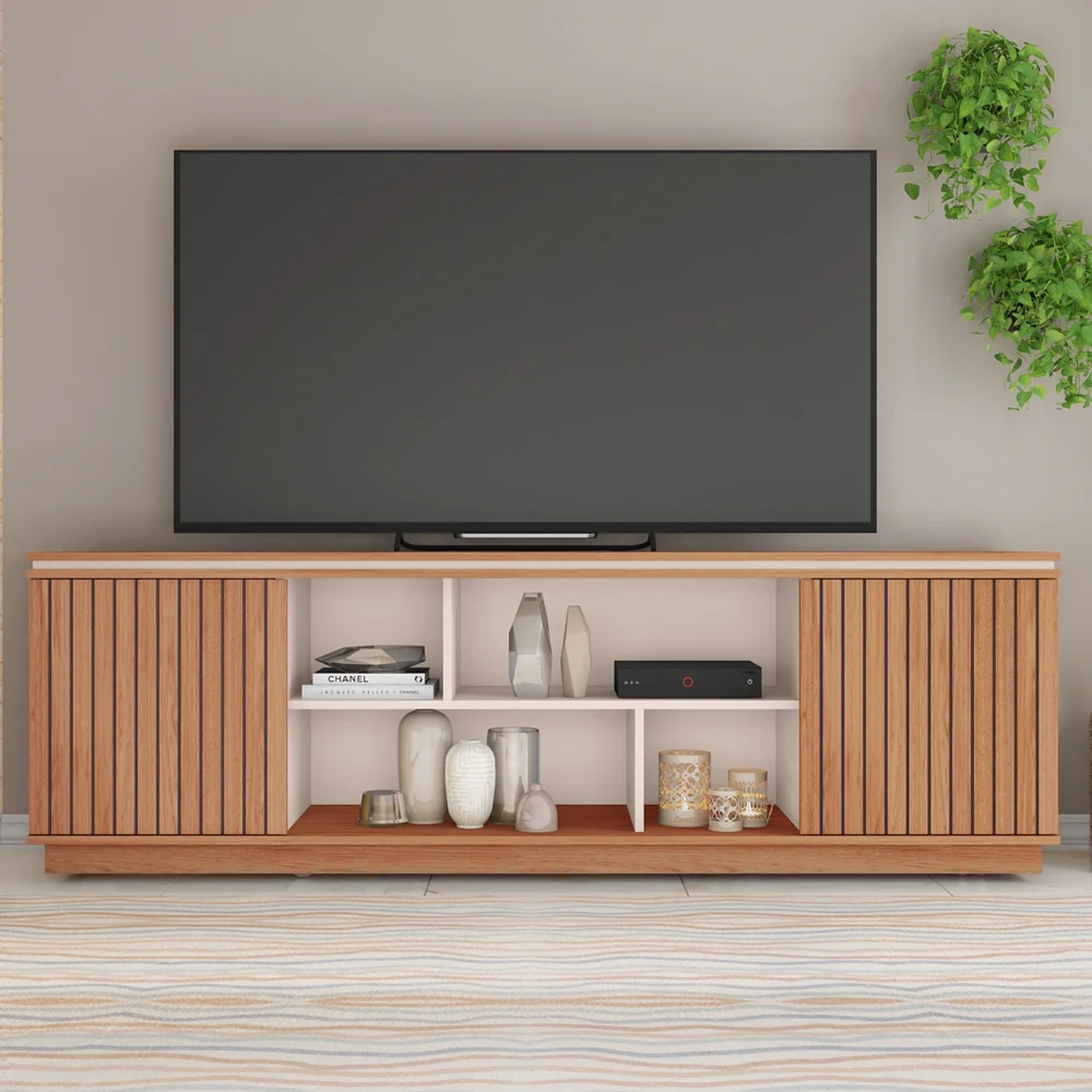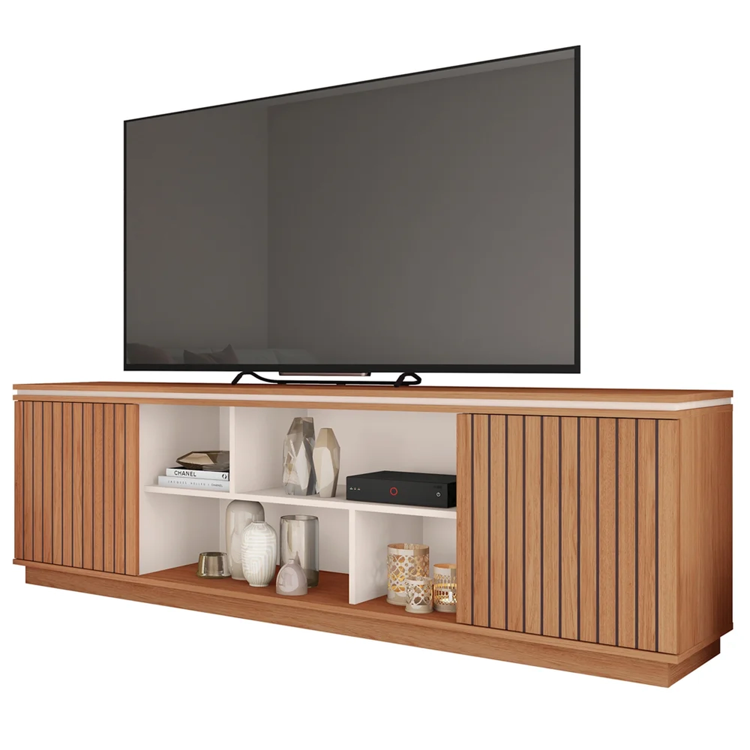 Descubra a harmonia perfeita para o seu refúgio de lazer com o Rack Para Sala Bancada de TV 75 Pol 180cm Simetria Freijó/Off White, da Caemmun.