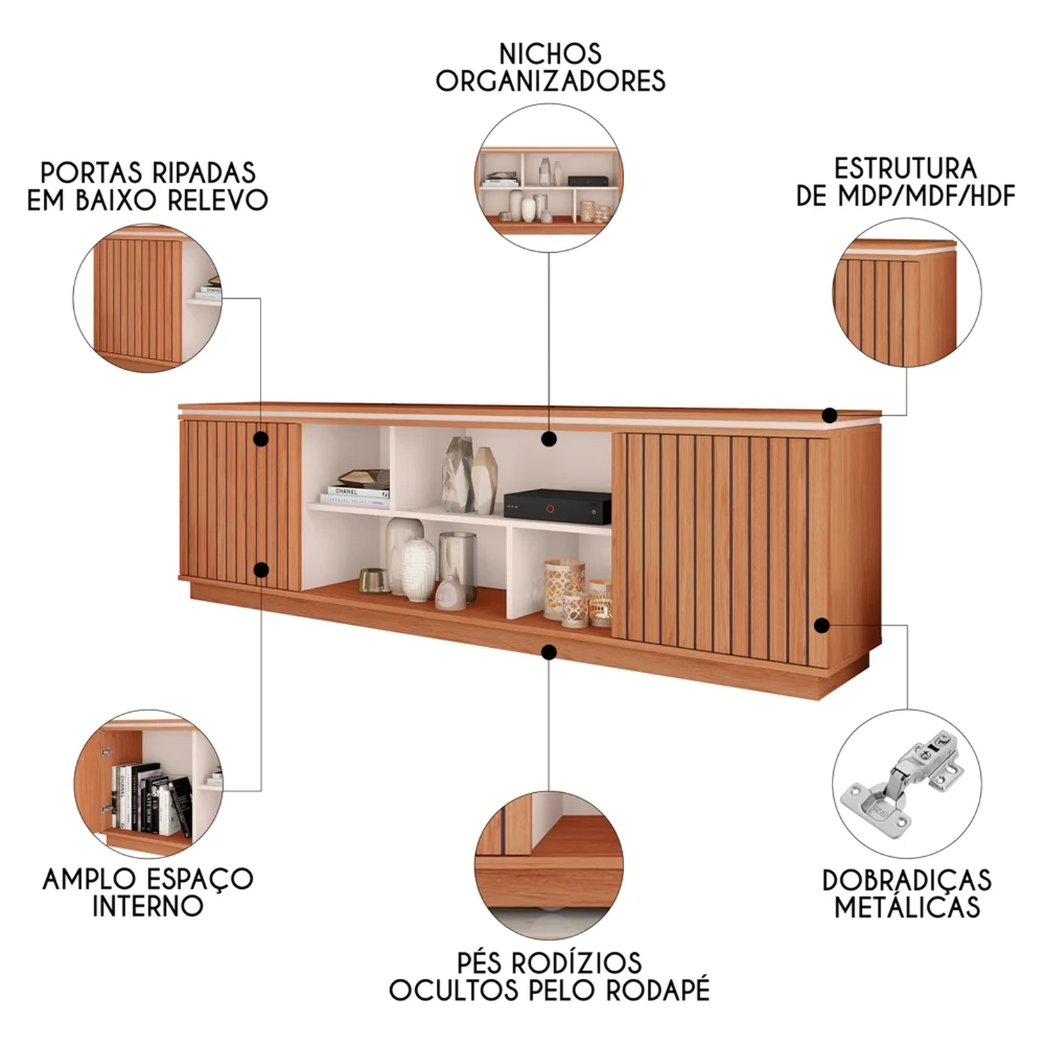 Projetado com linhas contemporâneas e acabamento em tonalidades atemporais, esse rack bancada suporta TVs de até 75 polegadas, transformando sua sala de estar em uma elegante central de entretenimento. Além disso, é fabricado com a robustez do MDP e MDF, e recebe destaque pelas portas ripadas em baixo relevo que adicionam um toque sofisticado ao ambiente. Por sua vez, a praticidade não é esquecida, graças ao amplo espaço interno e os nichos para os equipamentos eletrônicos e objetos decorativos. Ah, para completar, os rodízios ocultos pelo rodapé garantem um design mais elegante, além de ser muito funcional, principalmente se você gosta de redecorar o ambiente com frequência. Em outras palavras, esse rack sem painel é a Simetria perfeita para você que procura estilo e funcionalidade para a sua sala de estar.