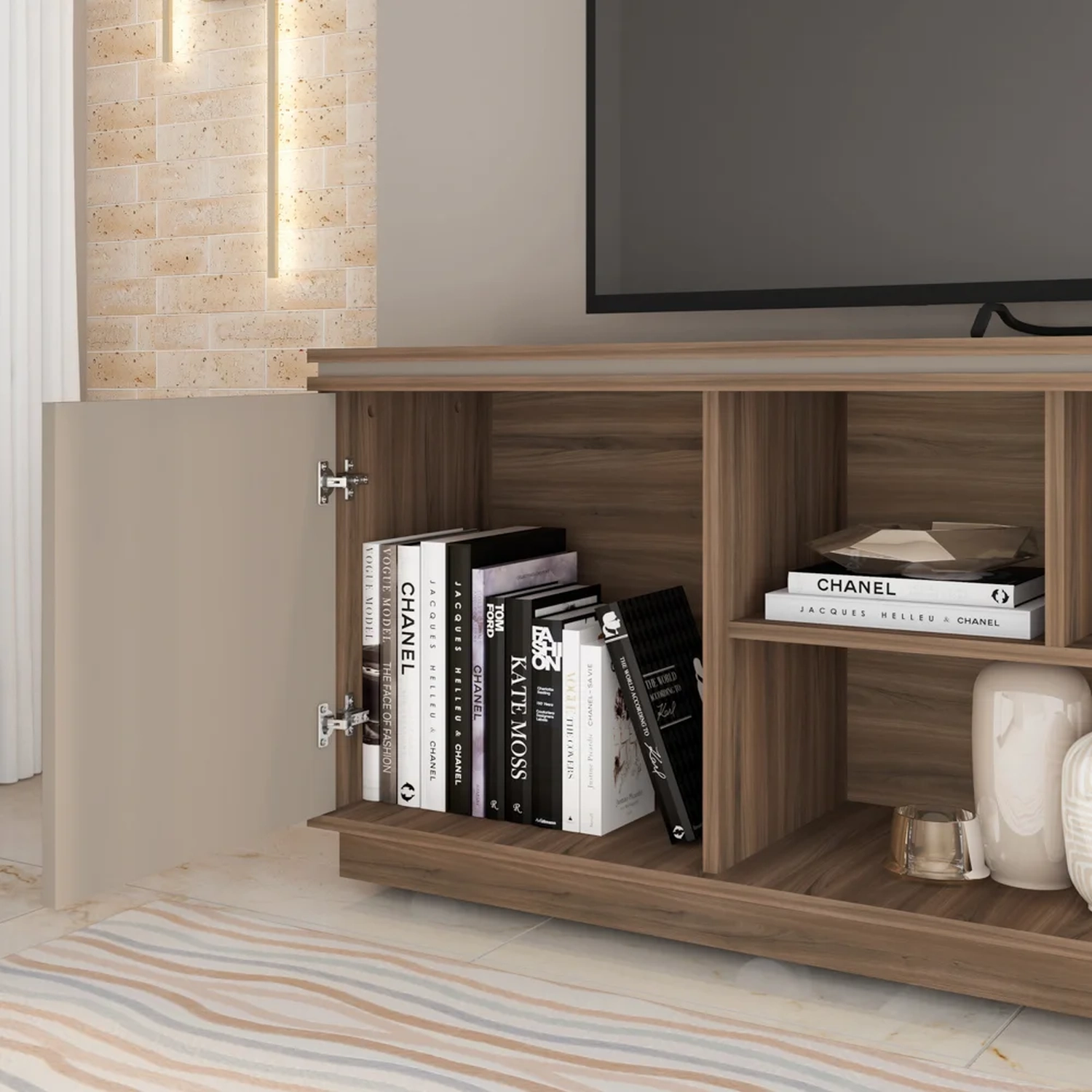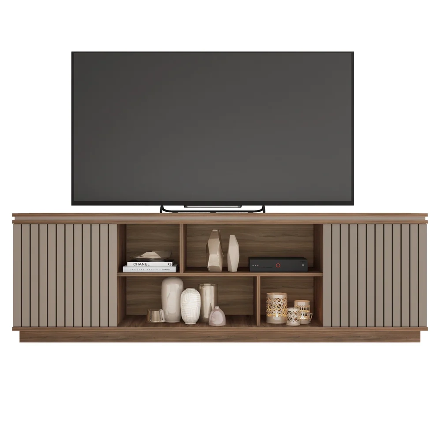 Descubra a harmonia perfeita para o seu refúgio de lazer com o Rack Para Sala Bancada de TV 75 Pol 180cm Simetria Nogueira/Fendi, da Caemmun.