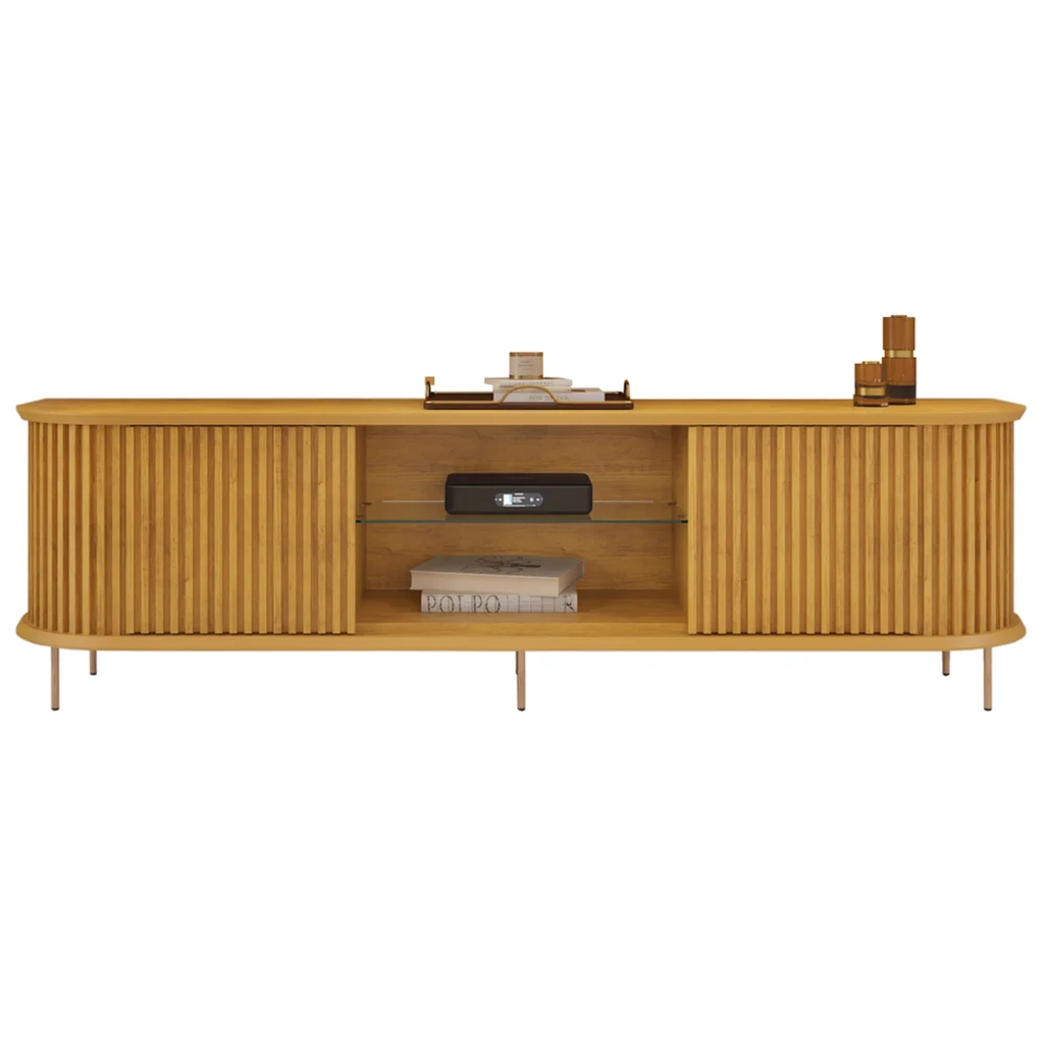 Ela tem um design moderno e sofisticado, com laterais curvas ripadas que dão um charme especial a Sala de Estar. O tampo e a base são usinados com cantos curvos e bordas chanfradas, seguindo as últimas tendências de decoração. A Bancada Para TV tem duas portas deslizantes e ripadas, que oferecem um amplo espaço para guardar seus objetos, e o detalhe ripado nas portas dispensa o uso de puxadores. Além disso, ela tem dois nichos para aparelhos eletrônicos, uma prateleira de vidro e um espaço extra para você aproveitar o melhor do entretenimento. Os cabos ficam organizados por trás do produto, graças aos passa-fios que facilitam a limpeza. A bancada é sustentada por pés metálicos cilíndricos na cor dourada, que a elevam do chão e aumentam sua durabilidade e facilita na hora da limpeza. O Rack Bancada é feito 100% de MDF, um material ecologicamente correto e resistente. O móvel ideal para deixar sua casa mais aconchegante e elegante.