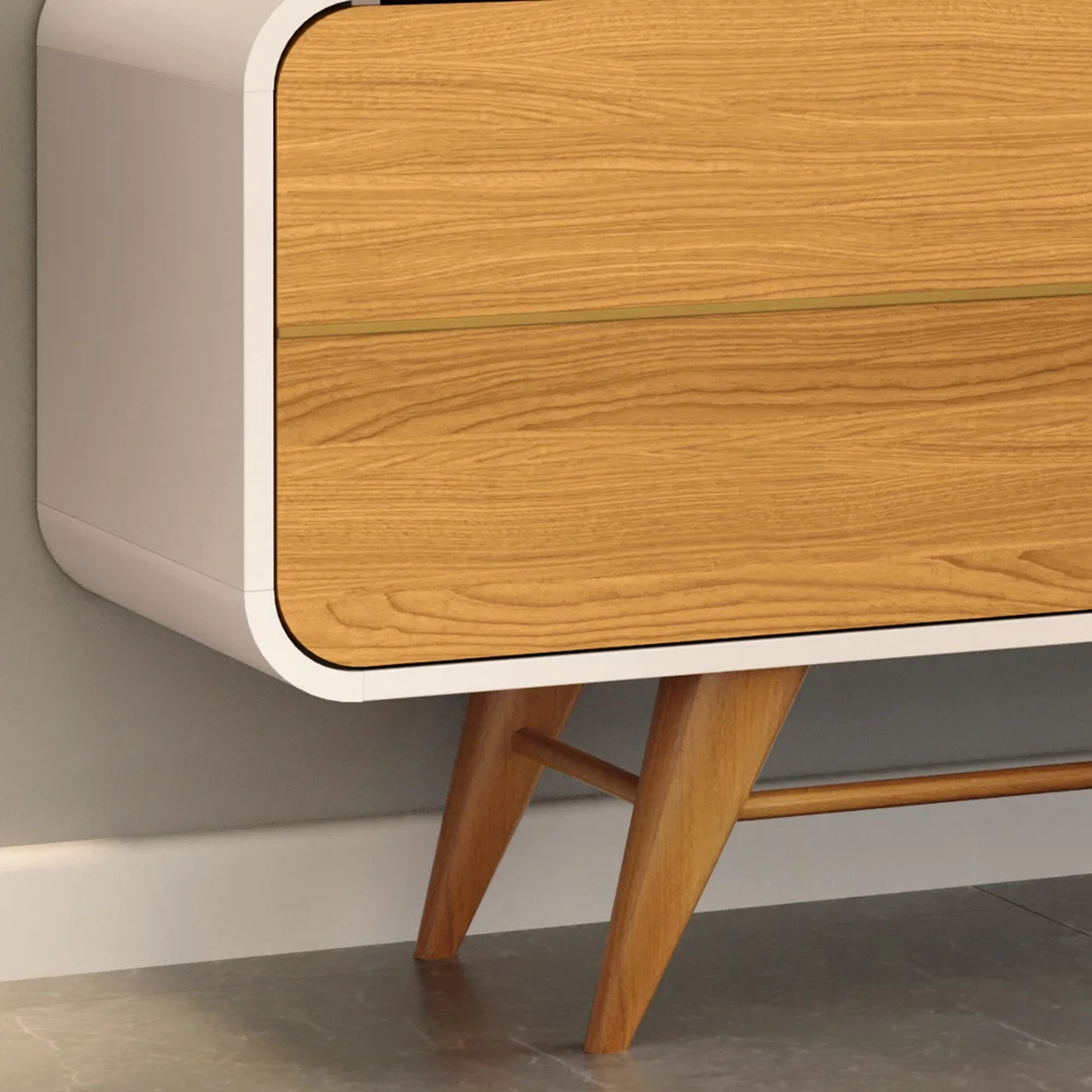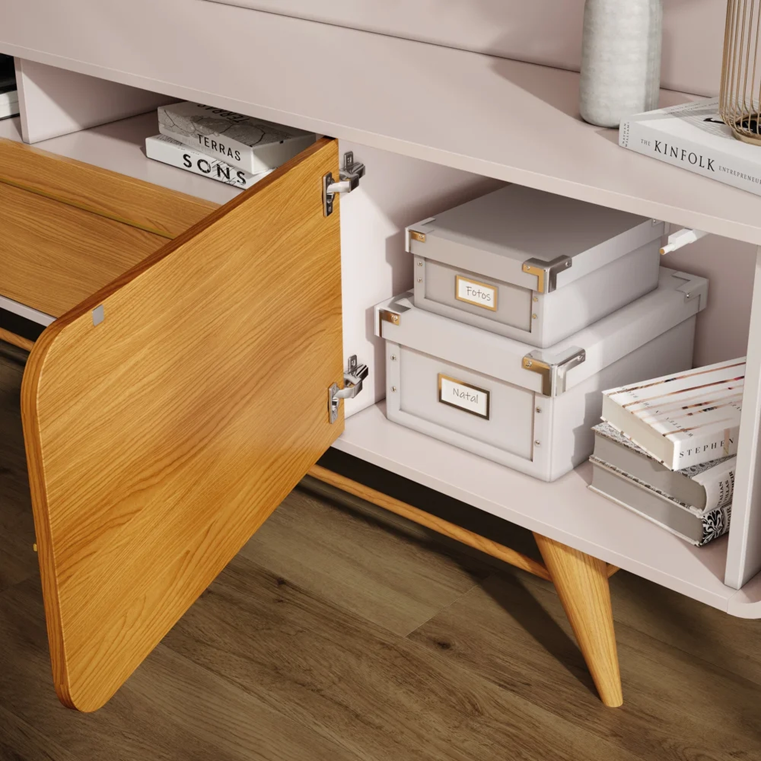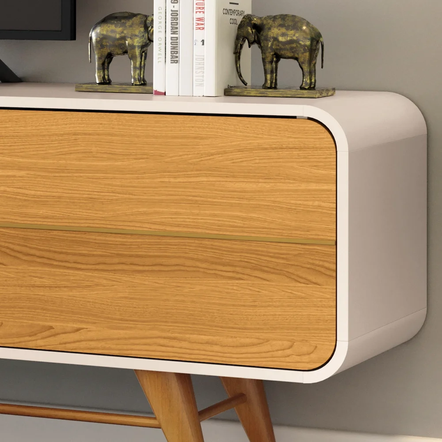Além da funcionalidade, com capacidade para acomodar TVs de até 85 polegadas, esse rack curvo ainda conta com um toque de contemporaneidade expresso nos cantos arredondados e nos filetes decorativos nas portas. Já os pés em madeira maciça torneados dão um adicionam charme, próprio do estilo retrô. Para completar, essa bancada possui três portas espaçosas, que oferecem amplo espaço de armazenamento para os mais diversos itens, enquanto os nichos centrais são ótimas opções para instalar os demais aparelhos eletrônicos.