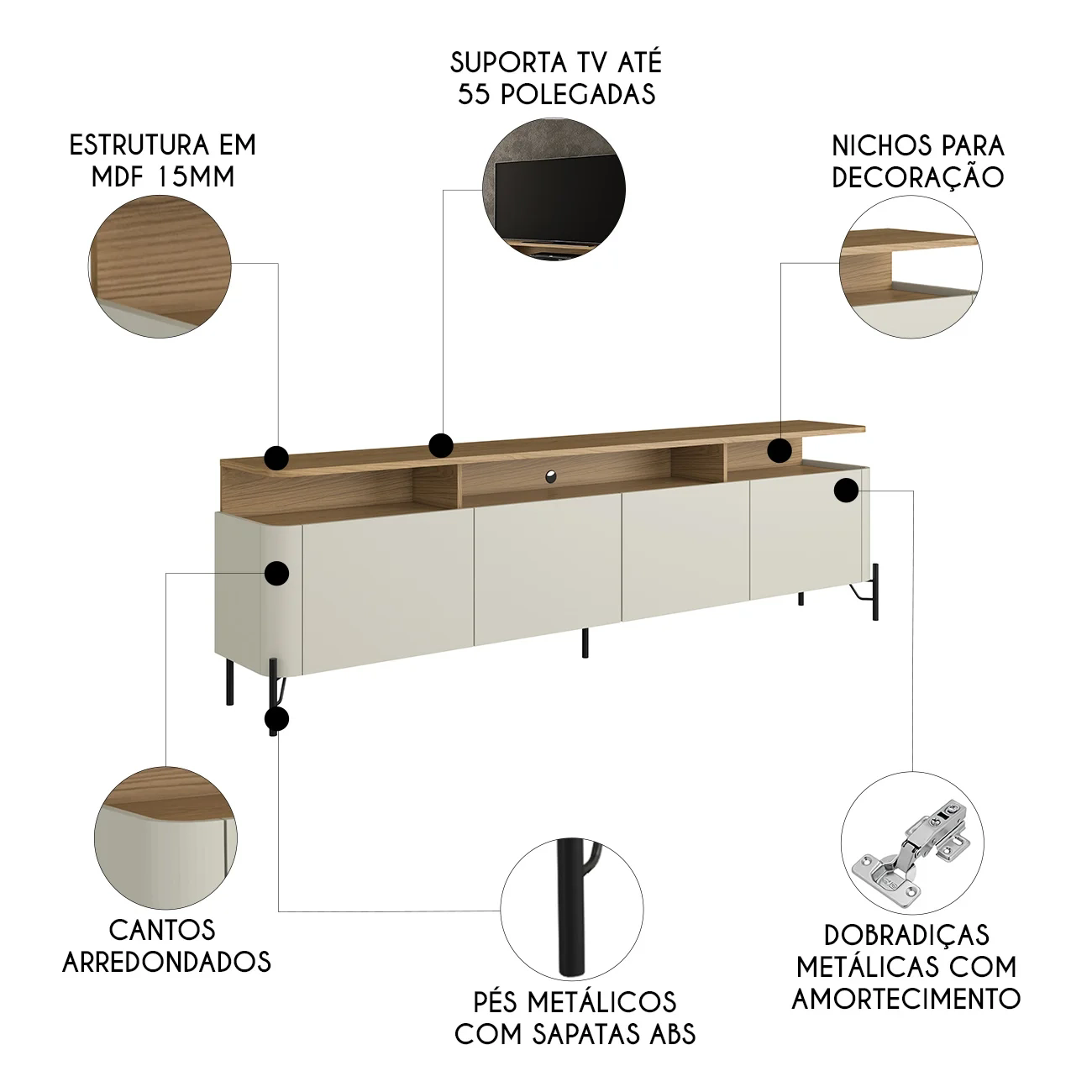 Rack TV 55 Pol 180cm Portas Lisas Blen Louro/Luna/Preto I06 - Mpozenato