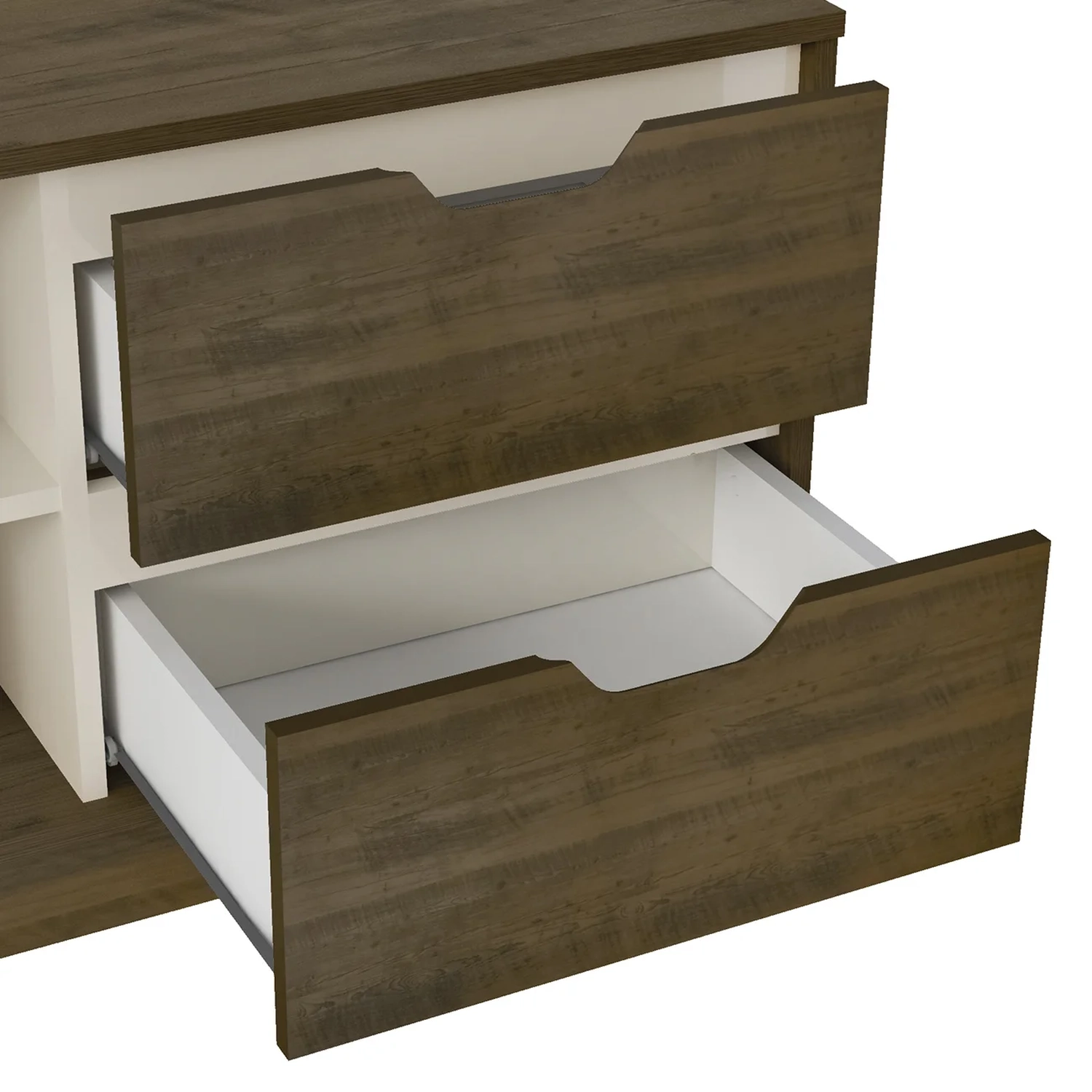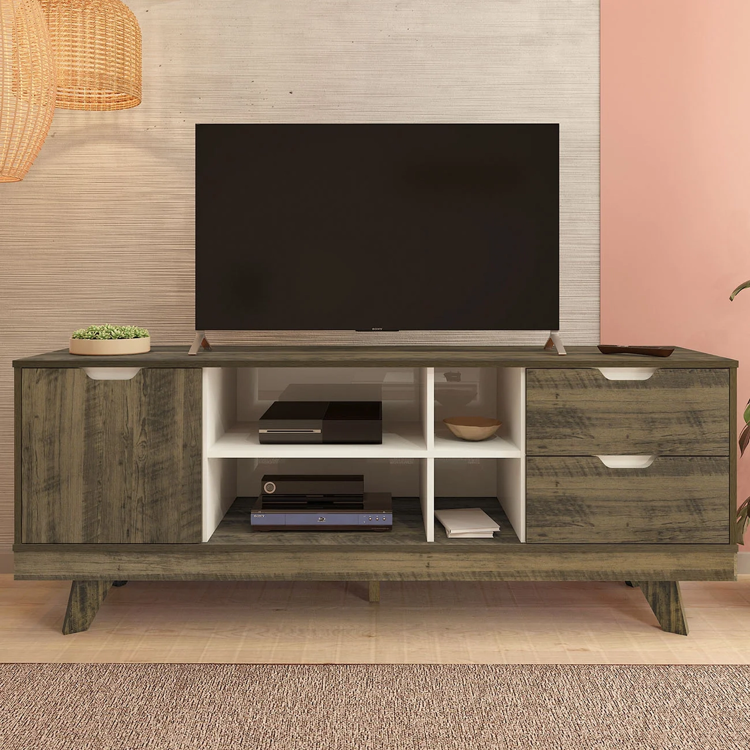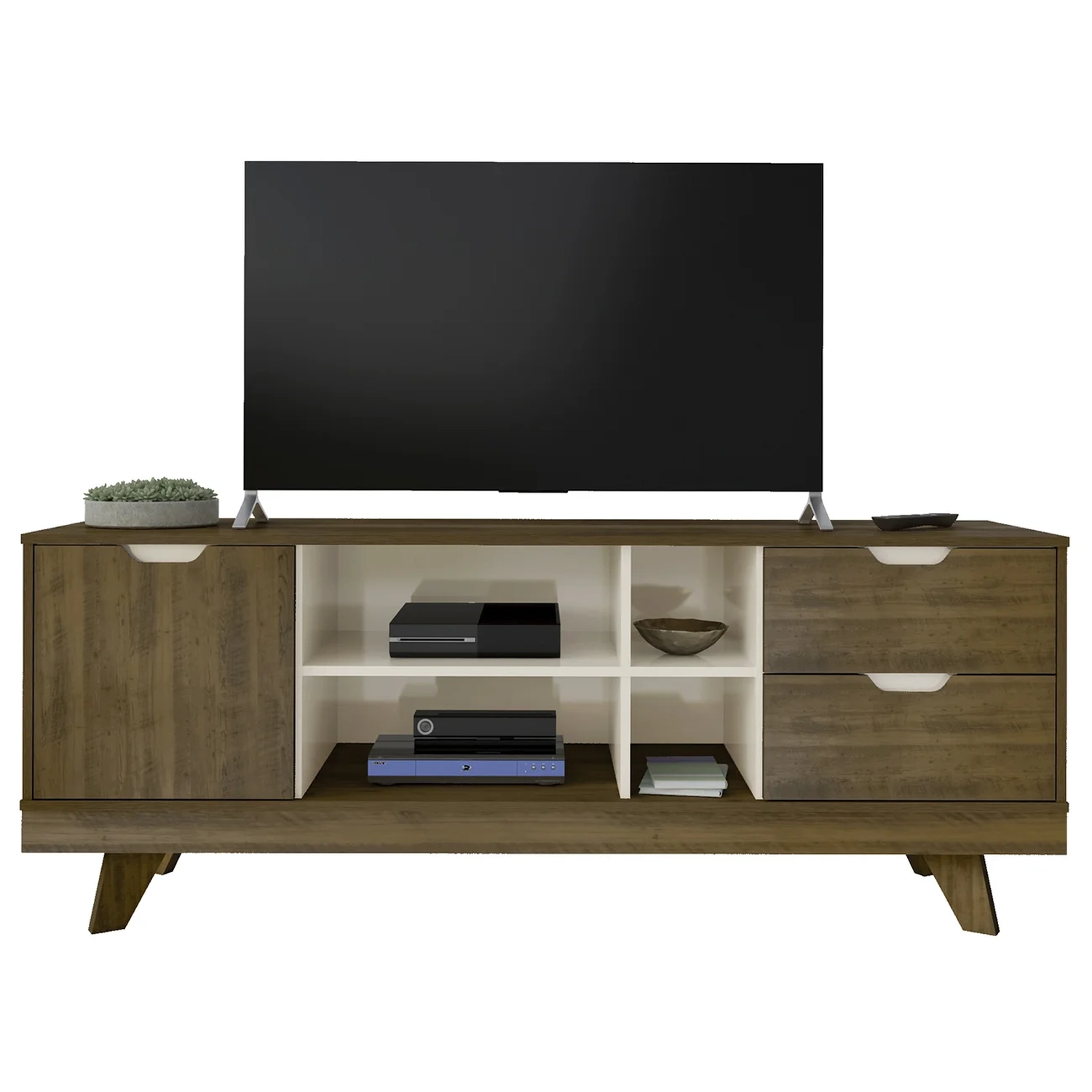 Com uma porta, quatro nichos e duas gavetas, este Rack Moderno oferece amplo armazenamento e organização. Seus puxadores embutidos destacam uma estética minimalista.