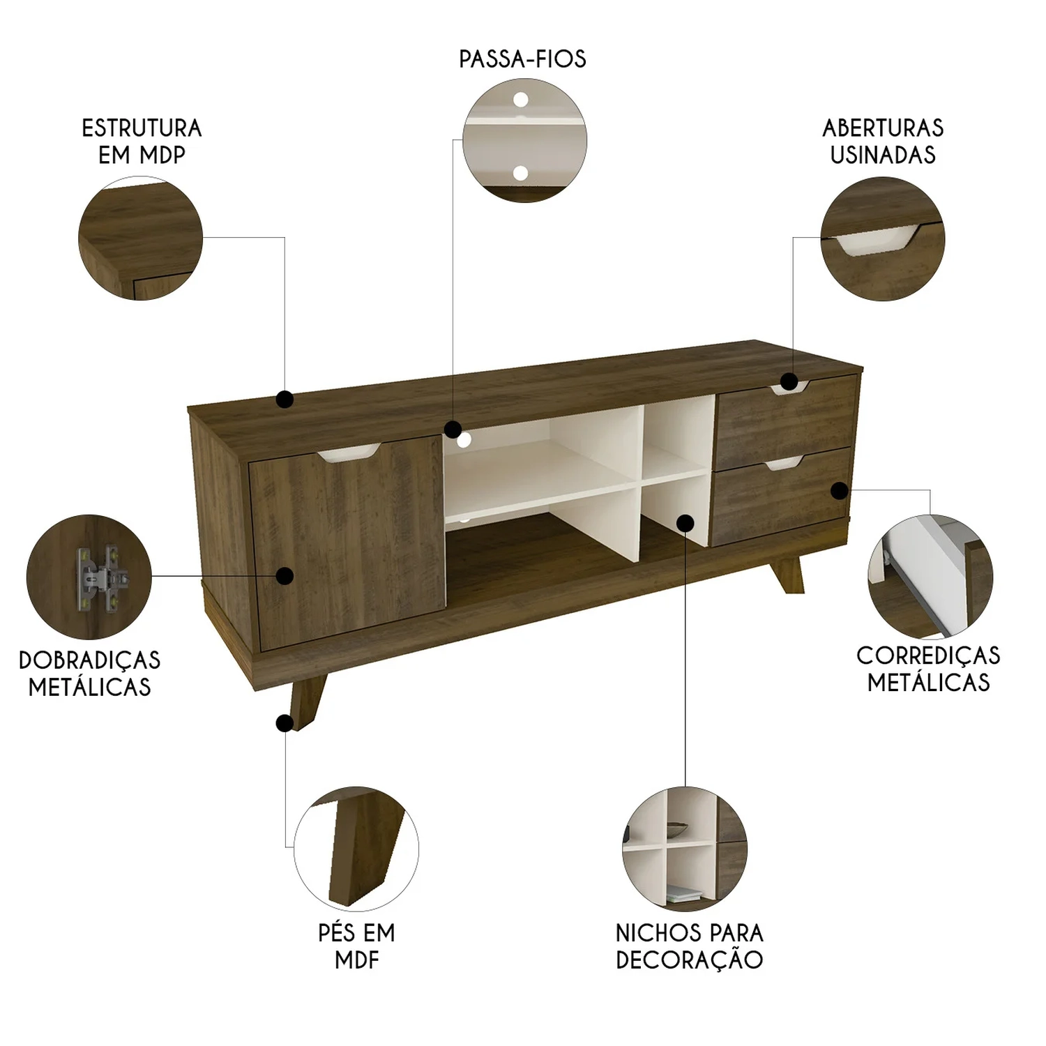 Este Rack Para Sala apresenta um visual moderno e elegante, com formas que valorizam o ambiente. Sua estrutura firme assegura resistência, sendo ideal para uma Sala de Estar funcional e bem decorada.