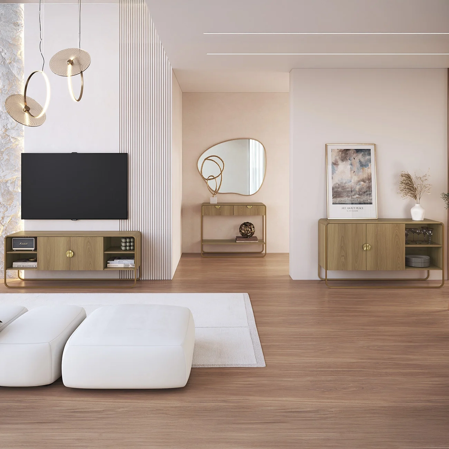 O Aparador Para Sala conta com gavetas com corrediças telescópicas e uma prateleira inferior, ideal para acomodar itens decorativos. Todos os móveis possuem puxadores dourados sofisticados, base em aço dourado com pintura epóxi e sapatas plásticas.