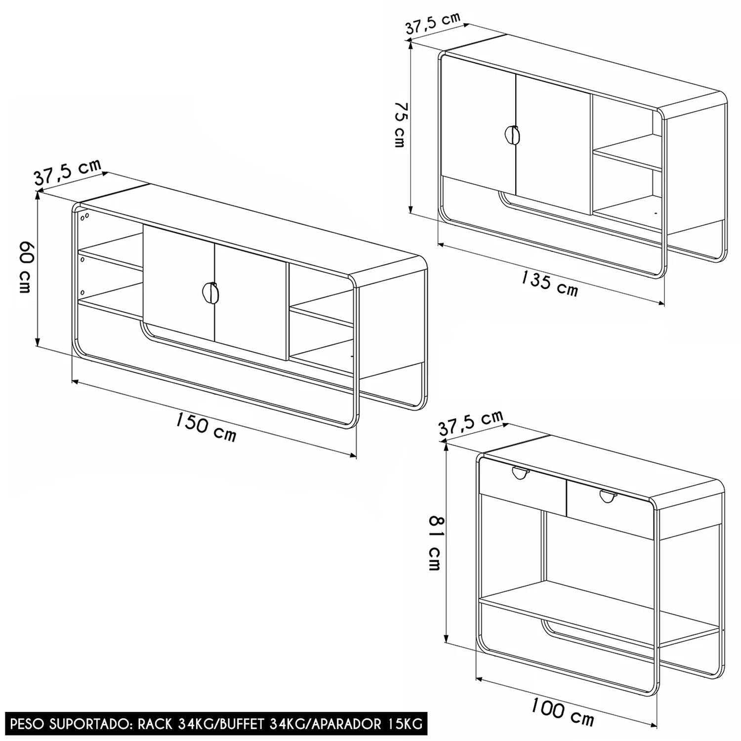 Conteúdo da Embalagem: 1 Rack, 1 Buffet, 1 Aparador.