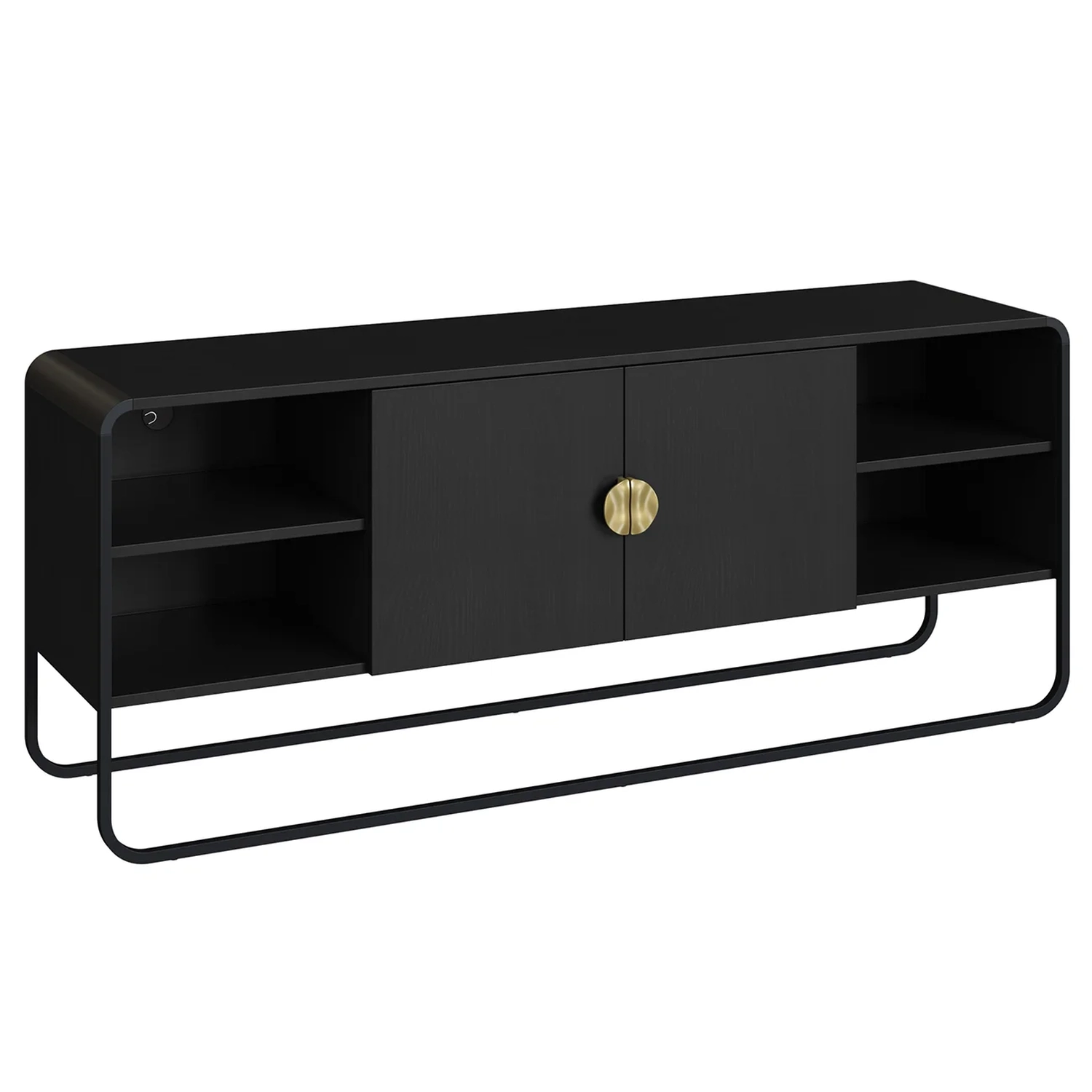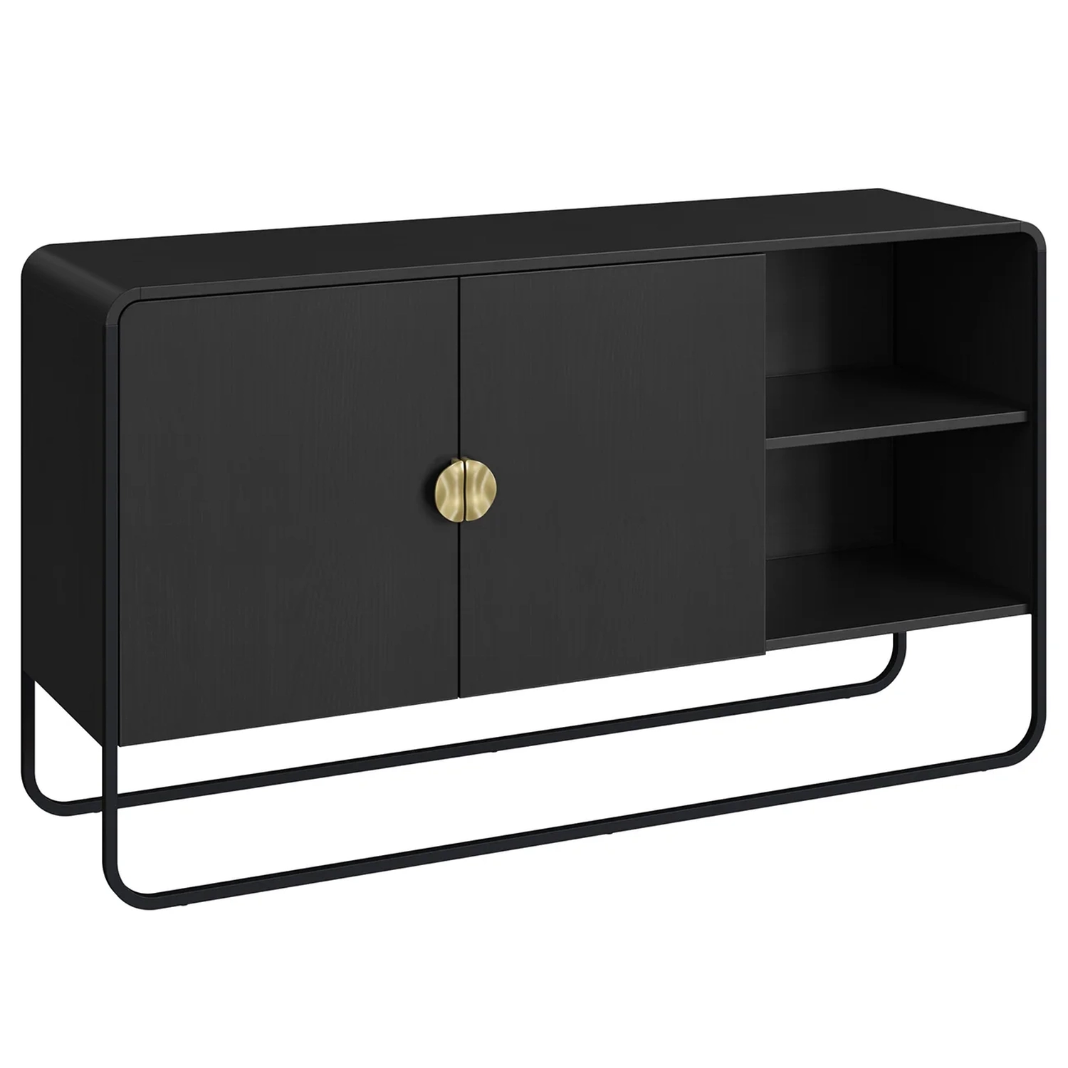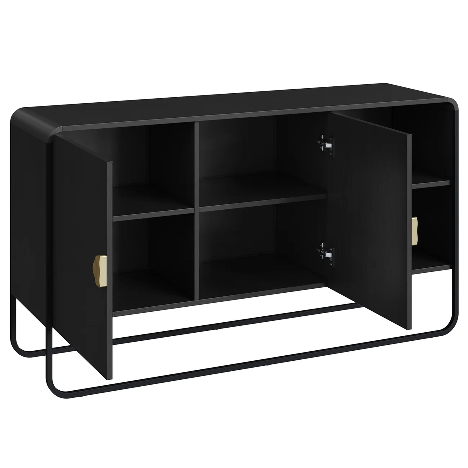 O Balcão Aparador oferece nichos abertos e portas com dobradiças metálicas, possui também um passa-fios embutido, o que o torna uma opção facilitada para organizar objetos ou acomodar aparelhos eletrônicos com maior praticidade e organização.