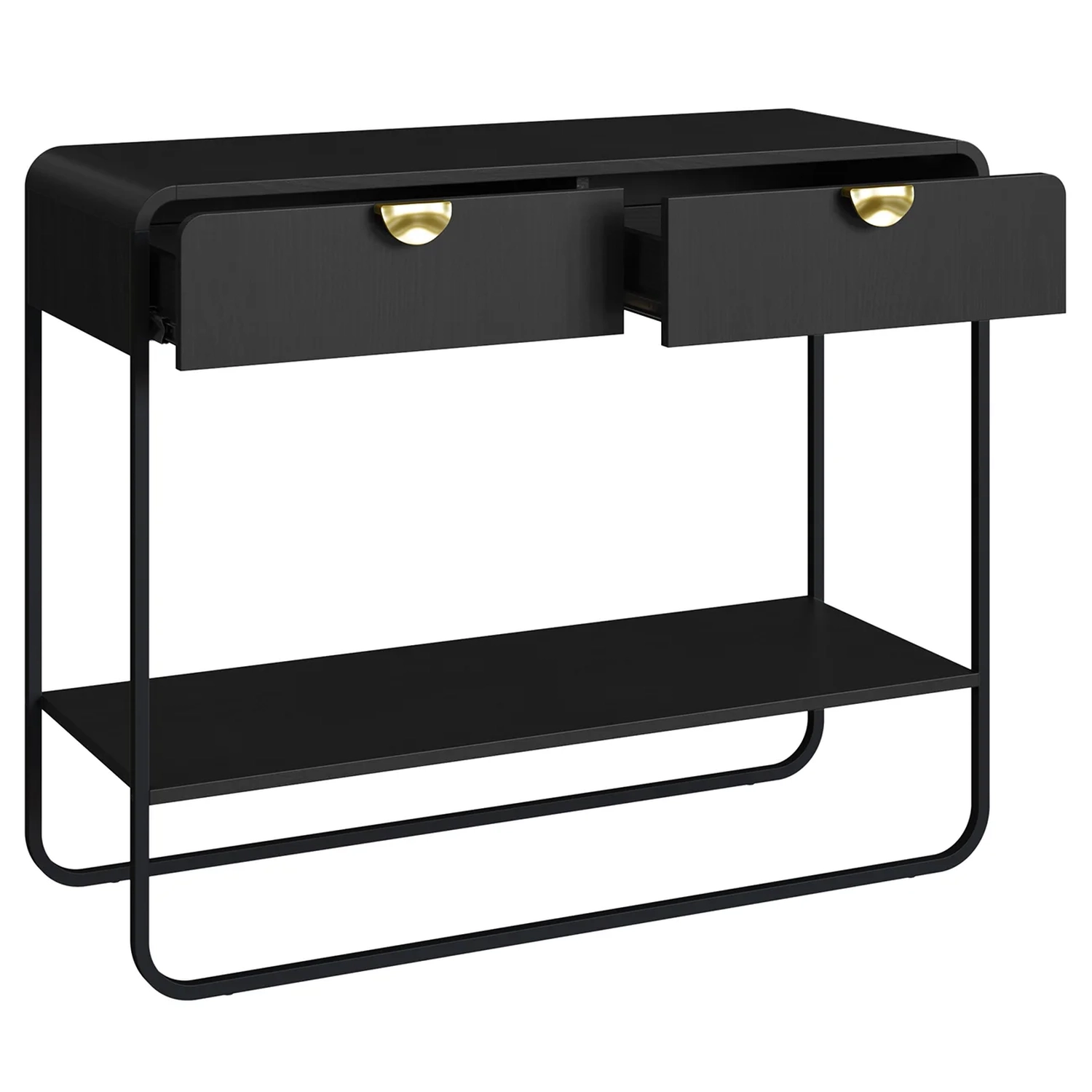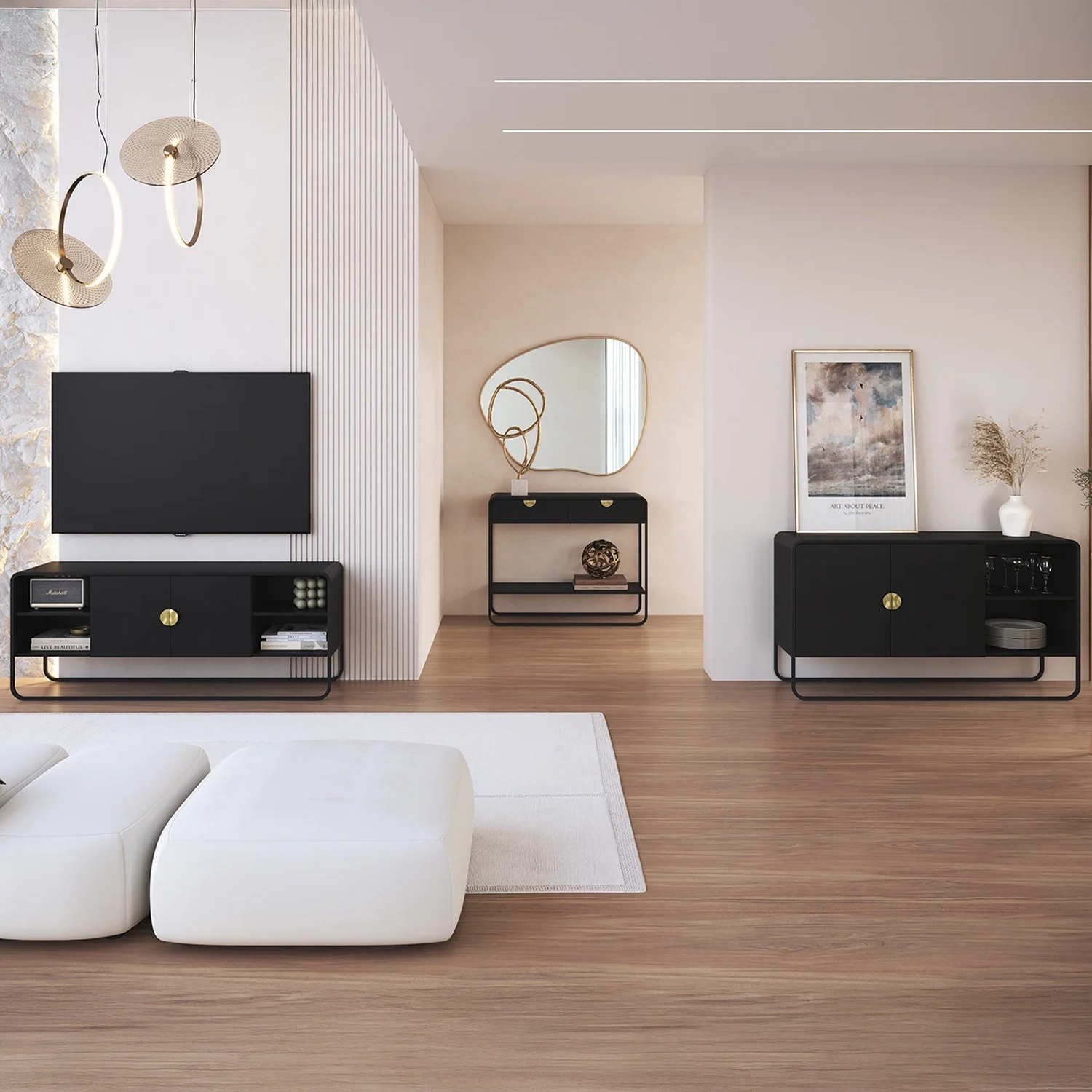 O Aparador Para Sala conta com gavetas com corrediças telescópicas e uma prateleira inferior, ideal para acomodar itens decorativos. Todos os móveis possuem puxadores dourados sofisticados, base em aço preto com pintura epóxi e sapatas plásticas.