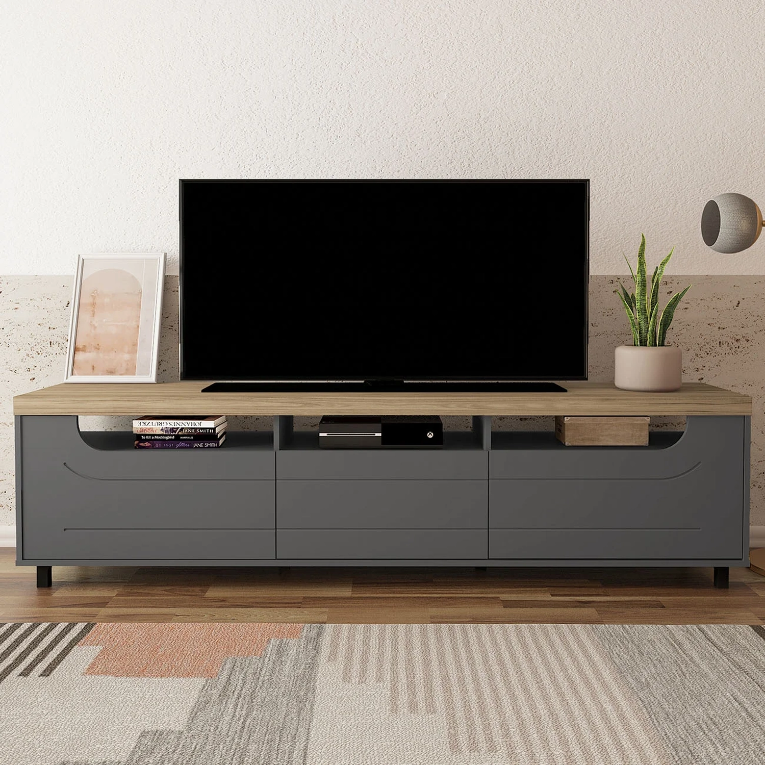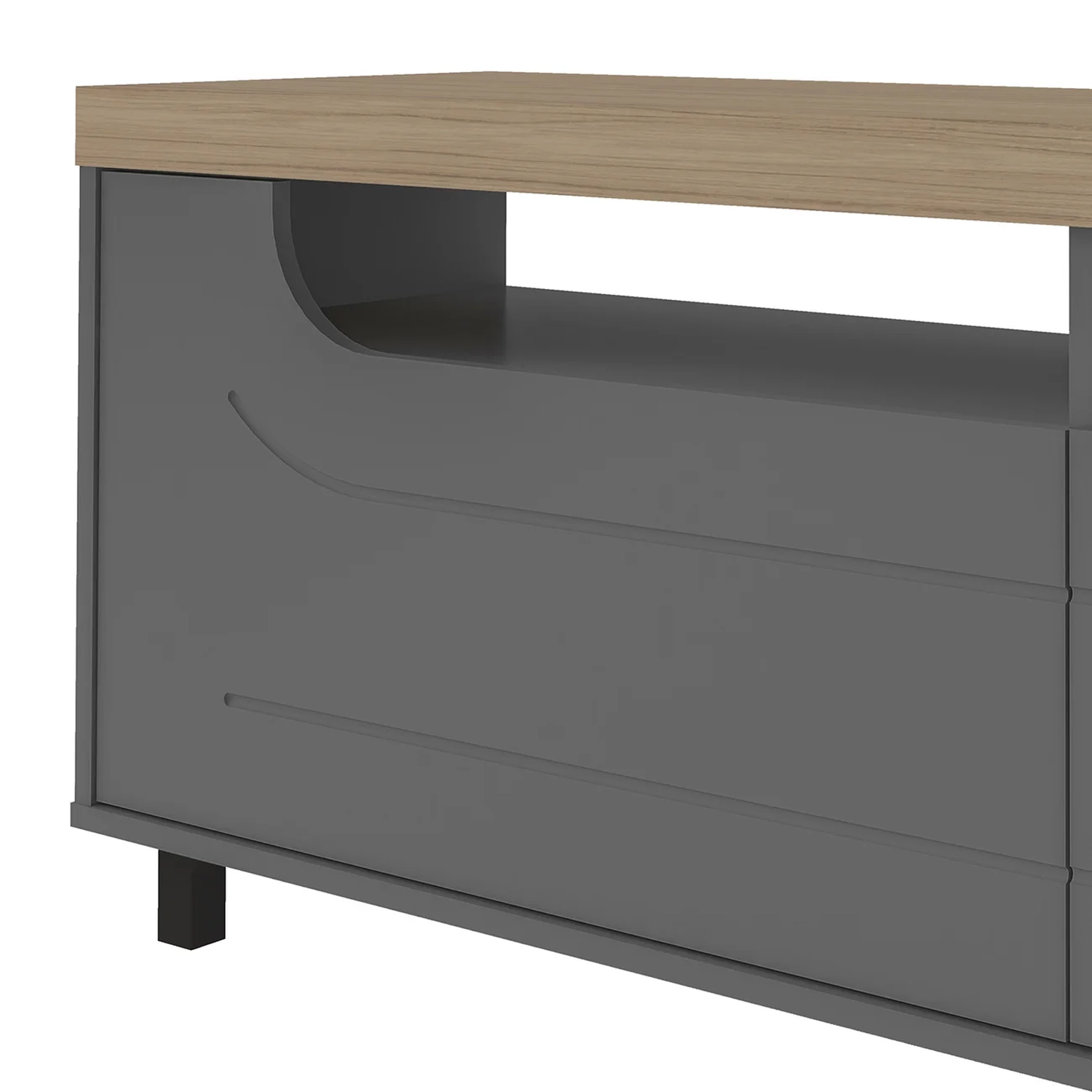 Com duas portas e uma gaveta, este Rack Para Sala Moderno oferece amplo armazenamento para diferentes objetos. A ausência de puxadores cria um visual clean, enquanto o fechamento com amortecimento garante suavidade e praticidade.