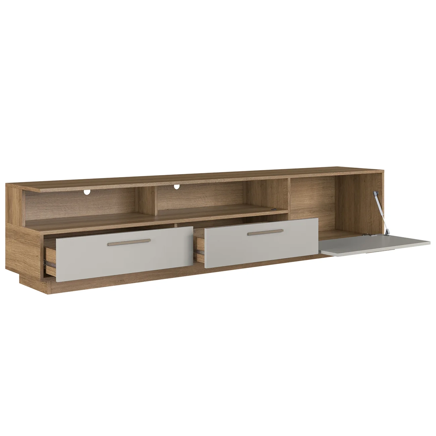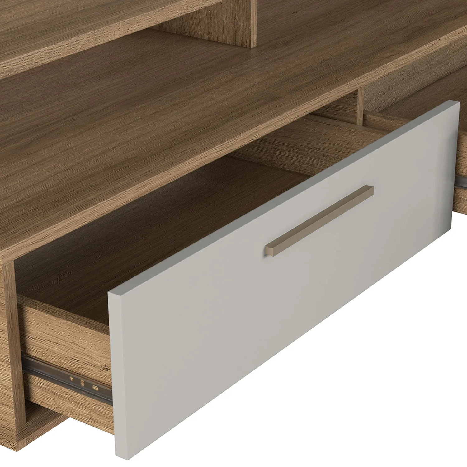 O Rack TV possui dois nichos ideais para eletrônicos, duas gavetas com corrediças telescópicas e uma porta basculante com dobradiças metálicas e pistão a gás que facilita a abertura. Seus puxadores em PVC trazem um acabamento moderno e funcional.